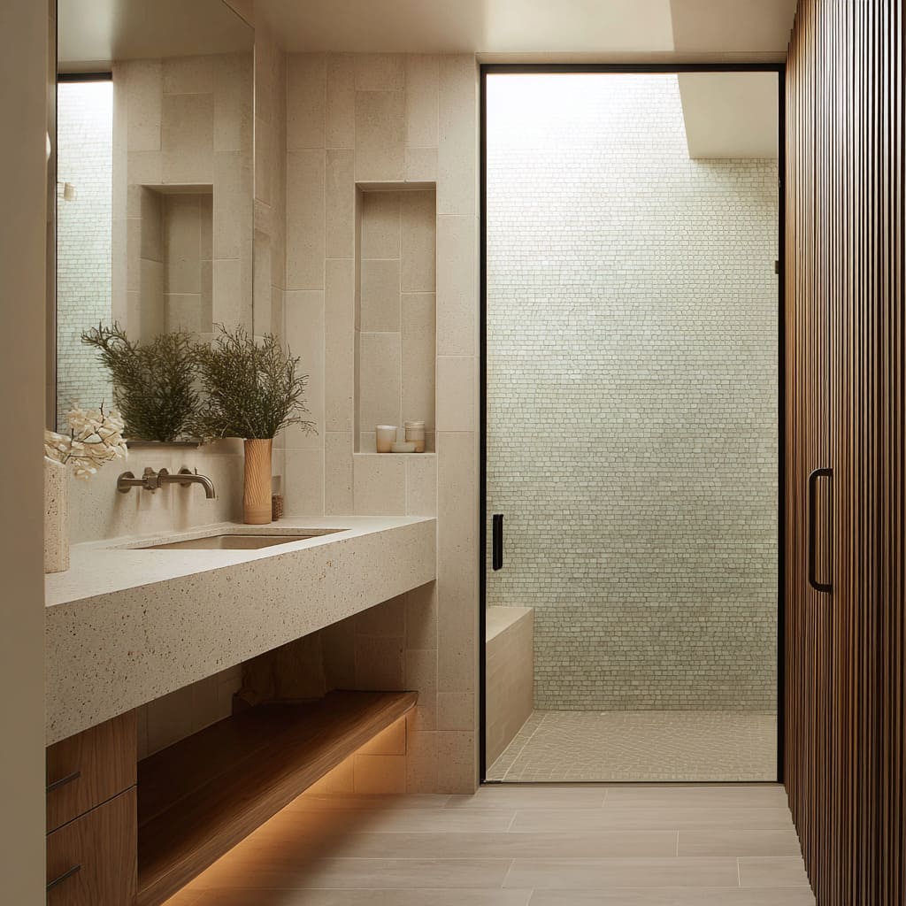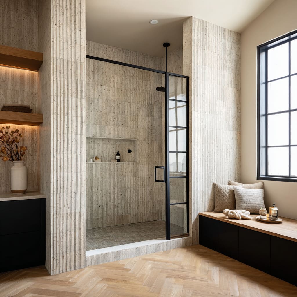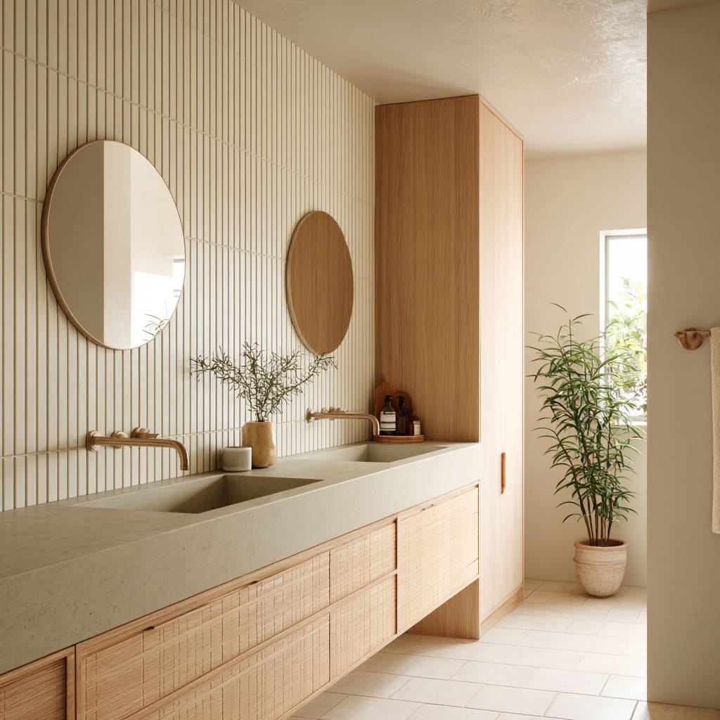 Warm wood appears beside ribbed tile or large stone to soften the atmosphere. Floating vanities in oak or ash bring horizontal calm beneath vertically structured walls.