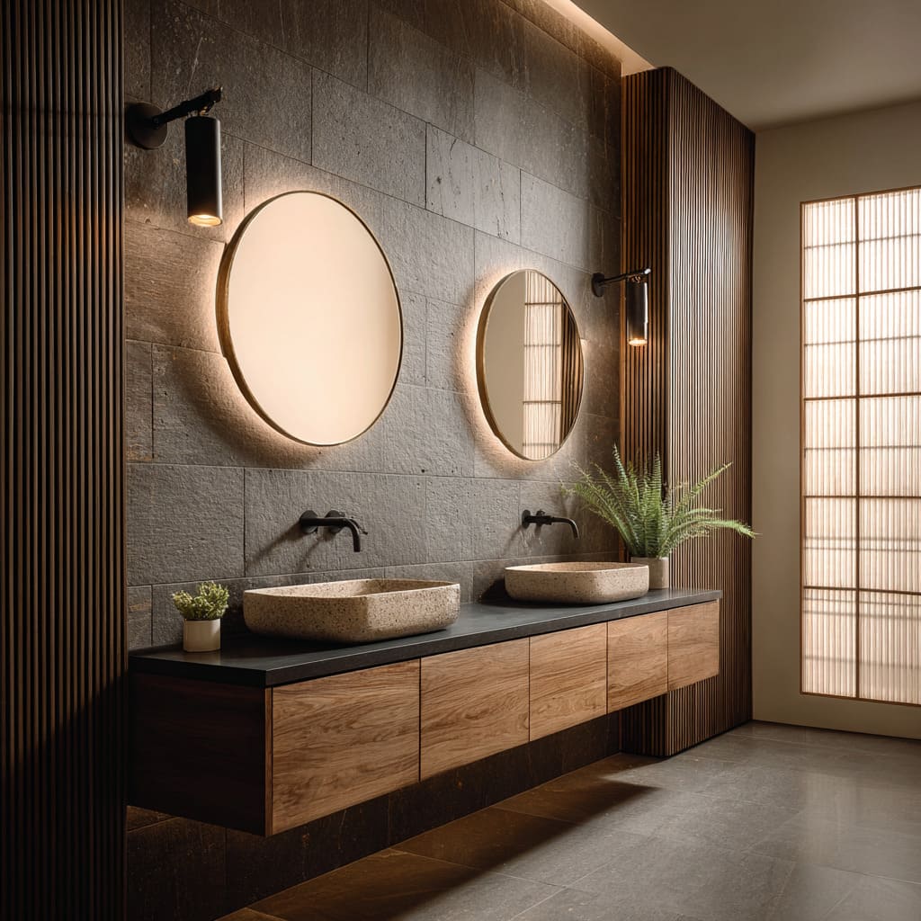- Halo Mirrors: Circular backlit mirrors make matte slate or dark stone glow in controlled rings.