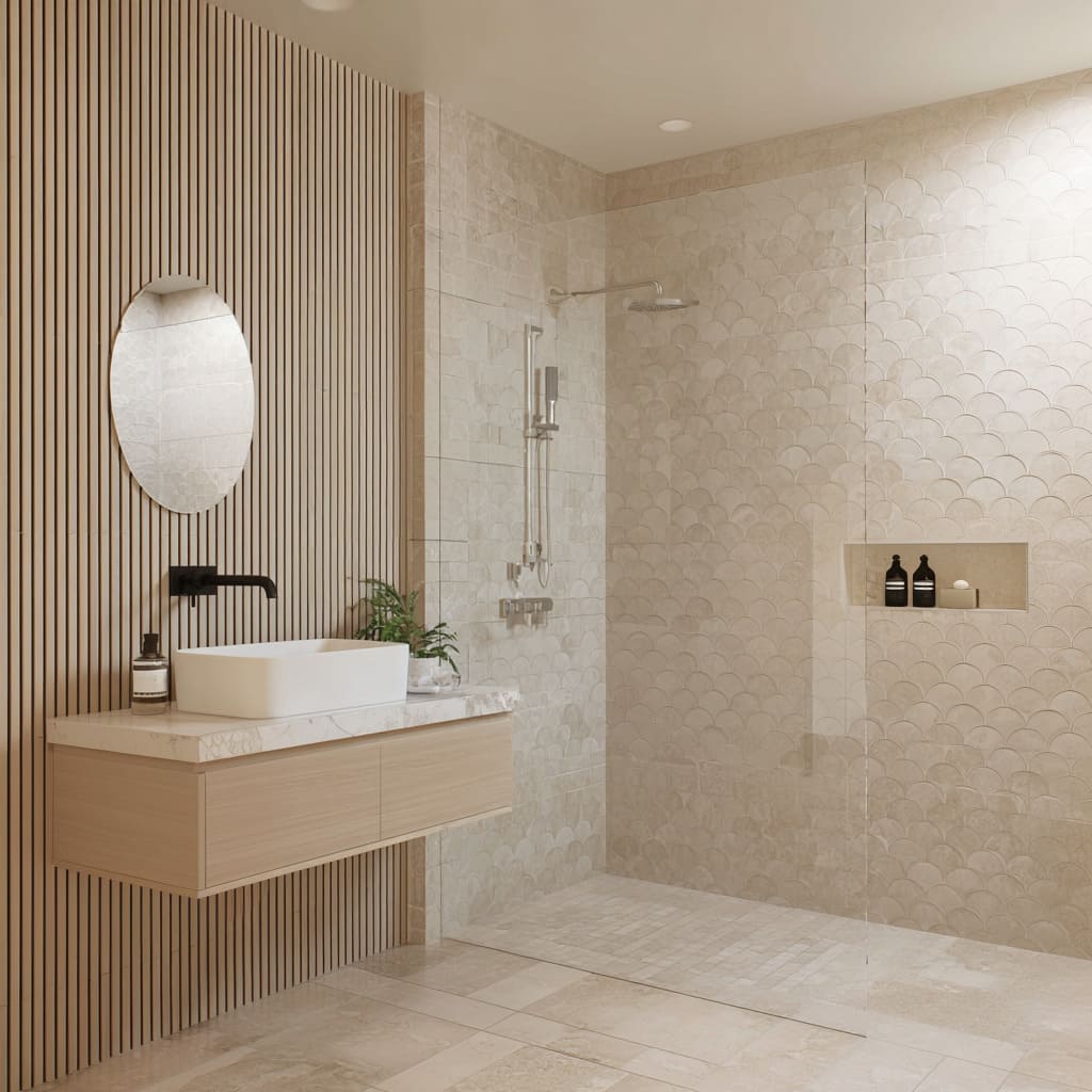 small mosaics vs. fluted ribs—creates depth that aligns naturally with the expressive qualities seen in bathroom tile ideas for small bathrooms, where depth illusions are especially effective.