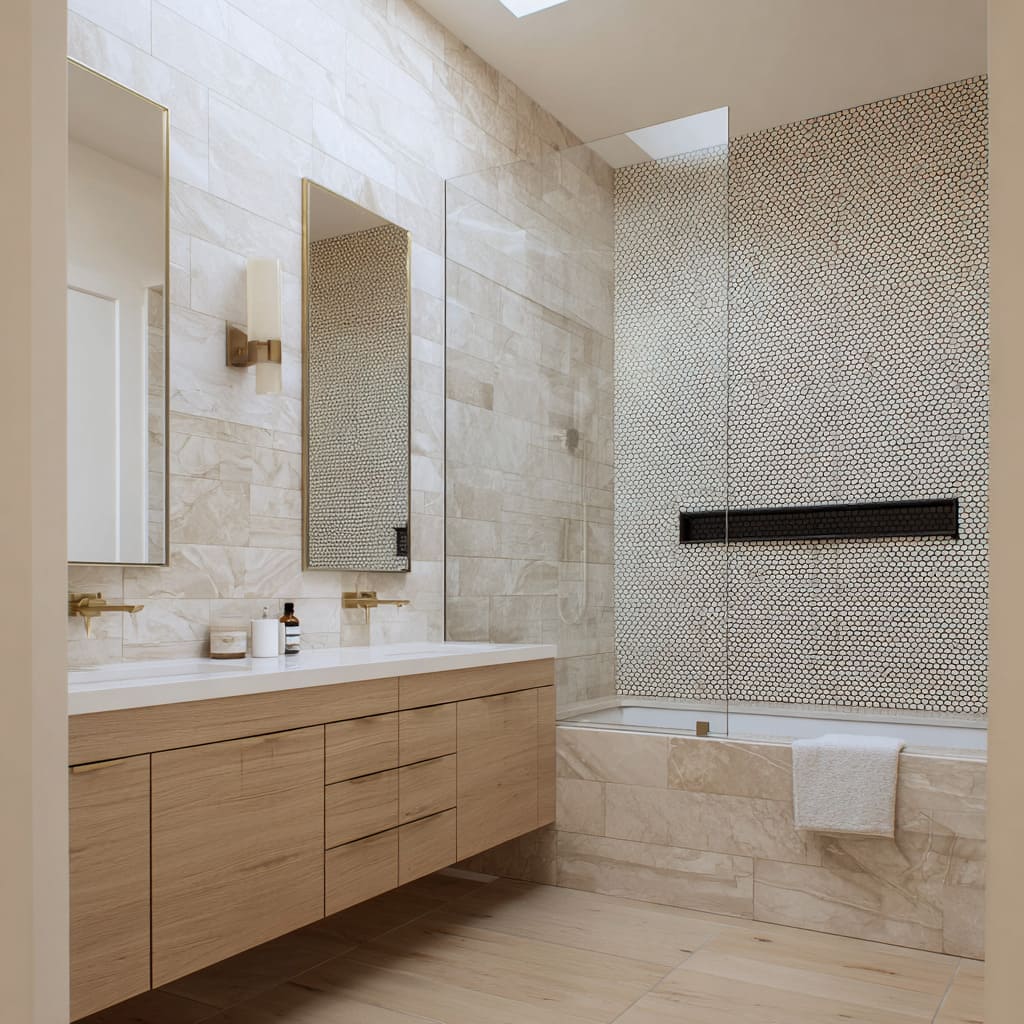These combinations reflect the more layered bathroom tile combinations seen in high-end interiors where tone harmony matters more than bold contrast.