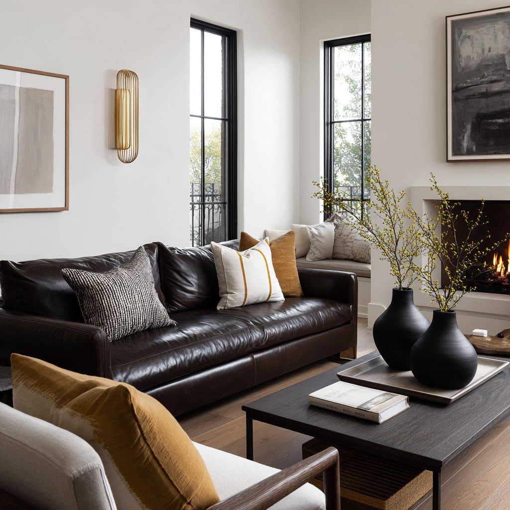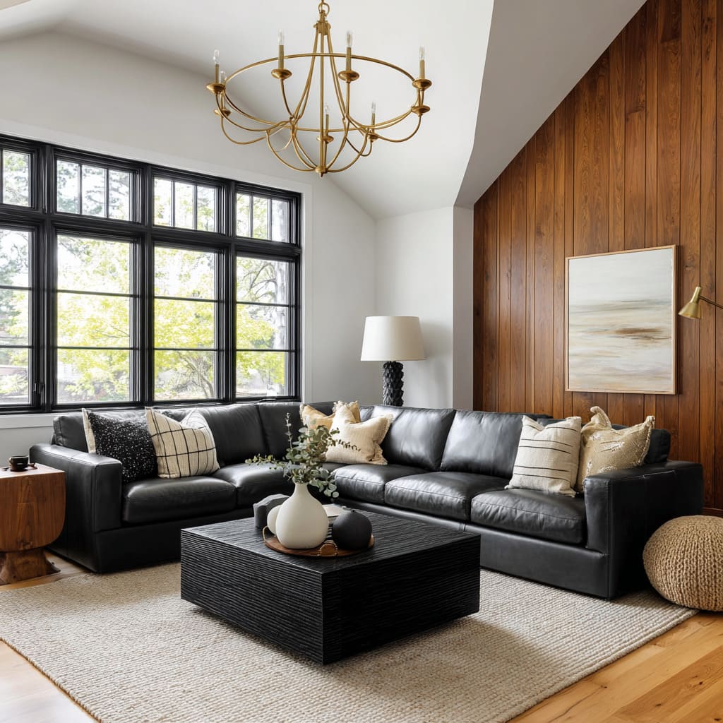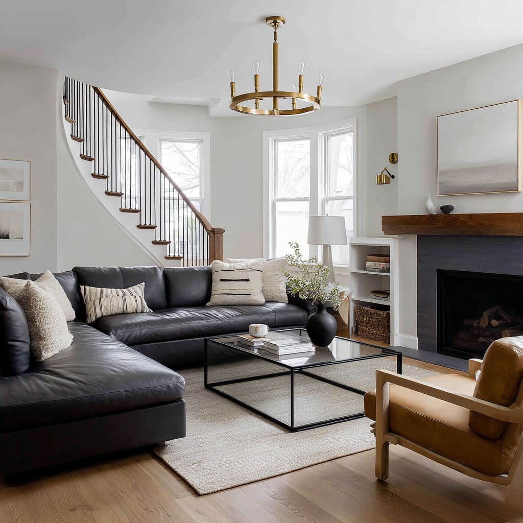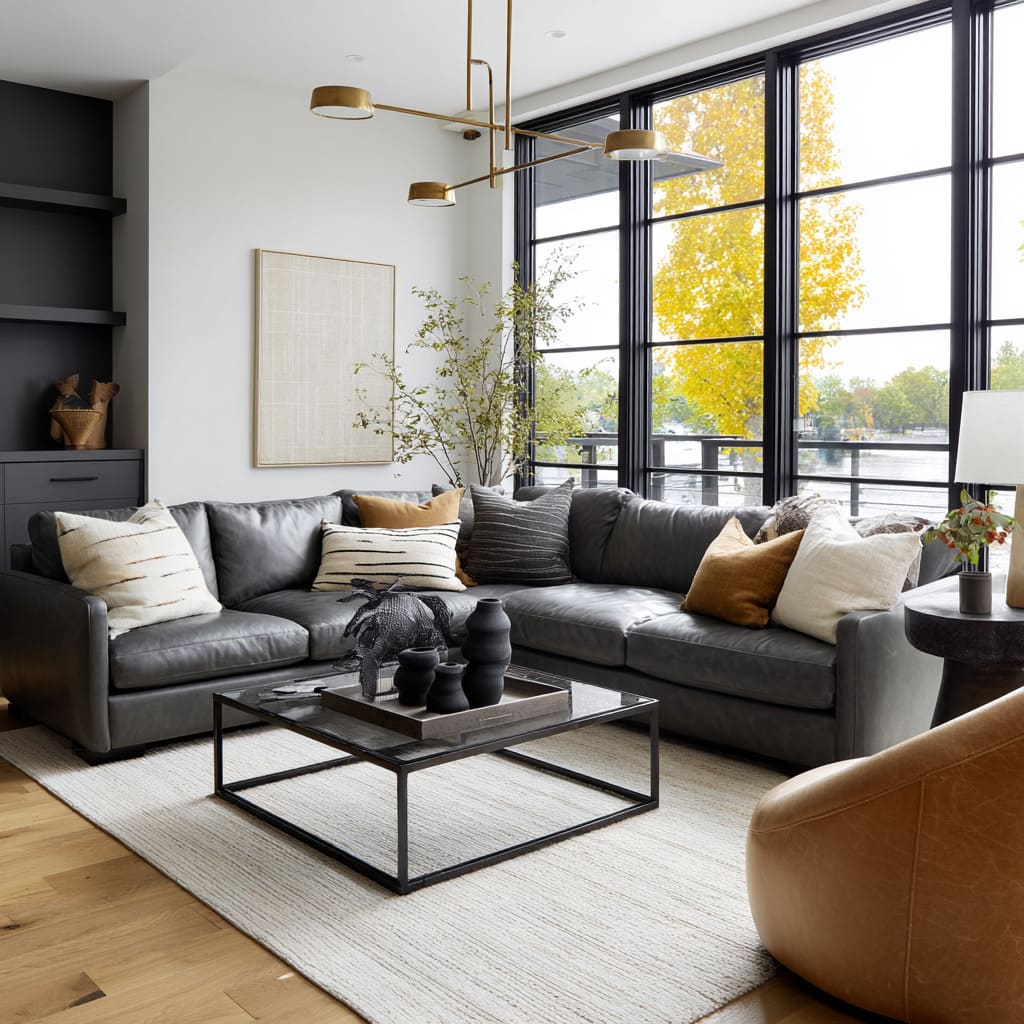 The most refined rooms treat the sofa as a large shadow form and build a clear hierarchy around it: big quiet planes (walls, rug field, sofa mass) and small crisp notes (thin black frames, a few sculptural objects, one defined lamp silhouette). That hierarchy is why a leather sectional with a gentle sheen can look expensive even with very few colors—the light catches the edges, so the outline stays clean instead of dull.