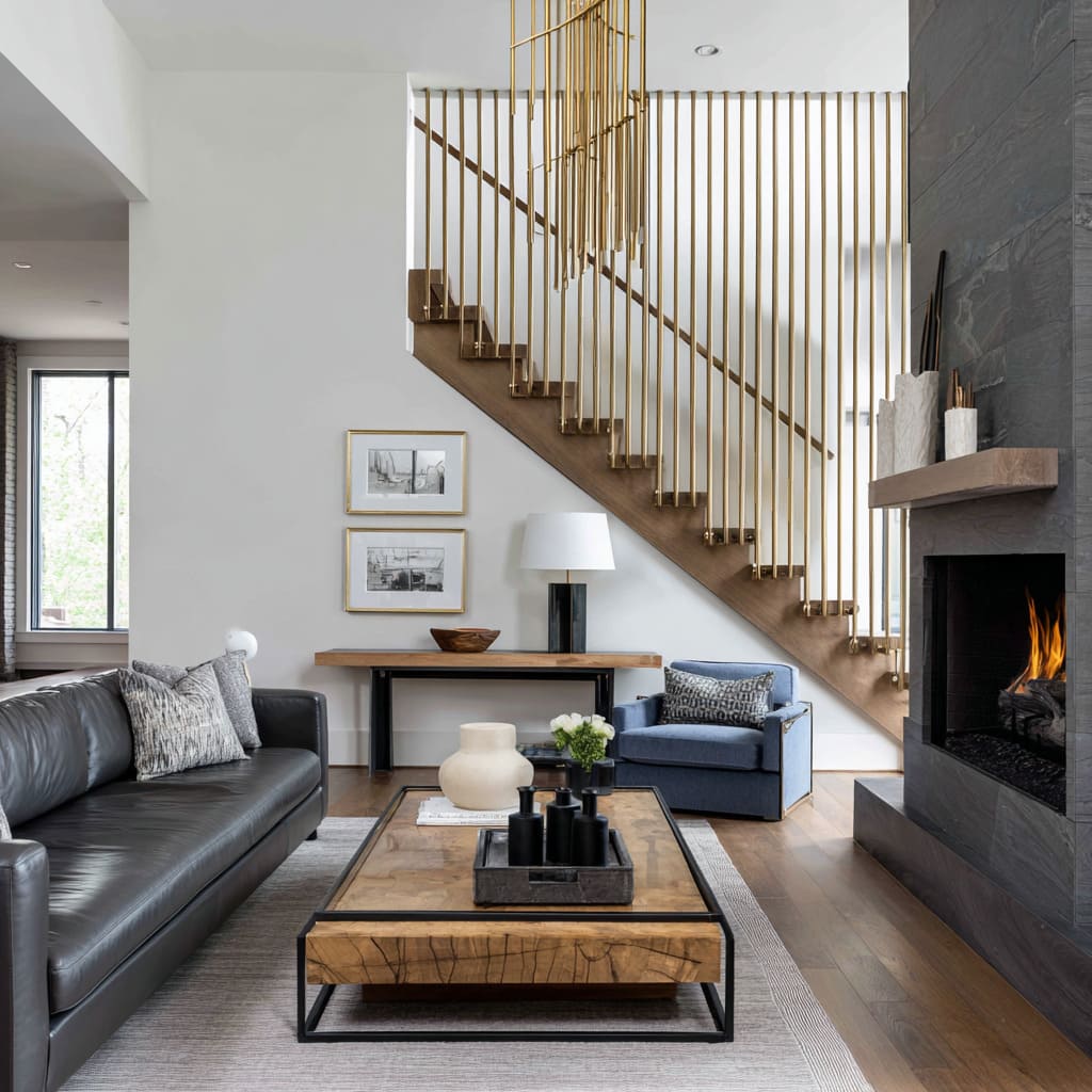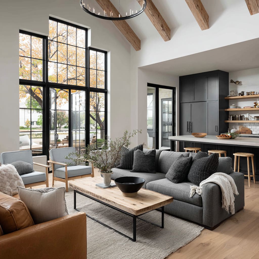Another consistent signal is edited repetition. When dark elements repeat as slim lines—window grids, stair spindles, table bases—the room feels intentional rather than severe.