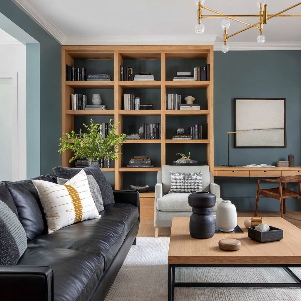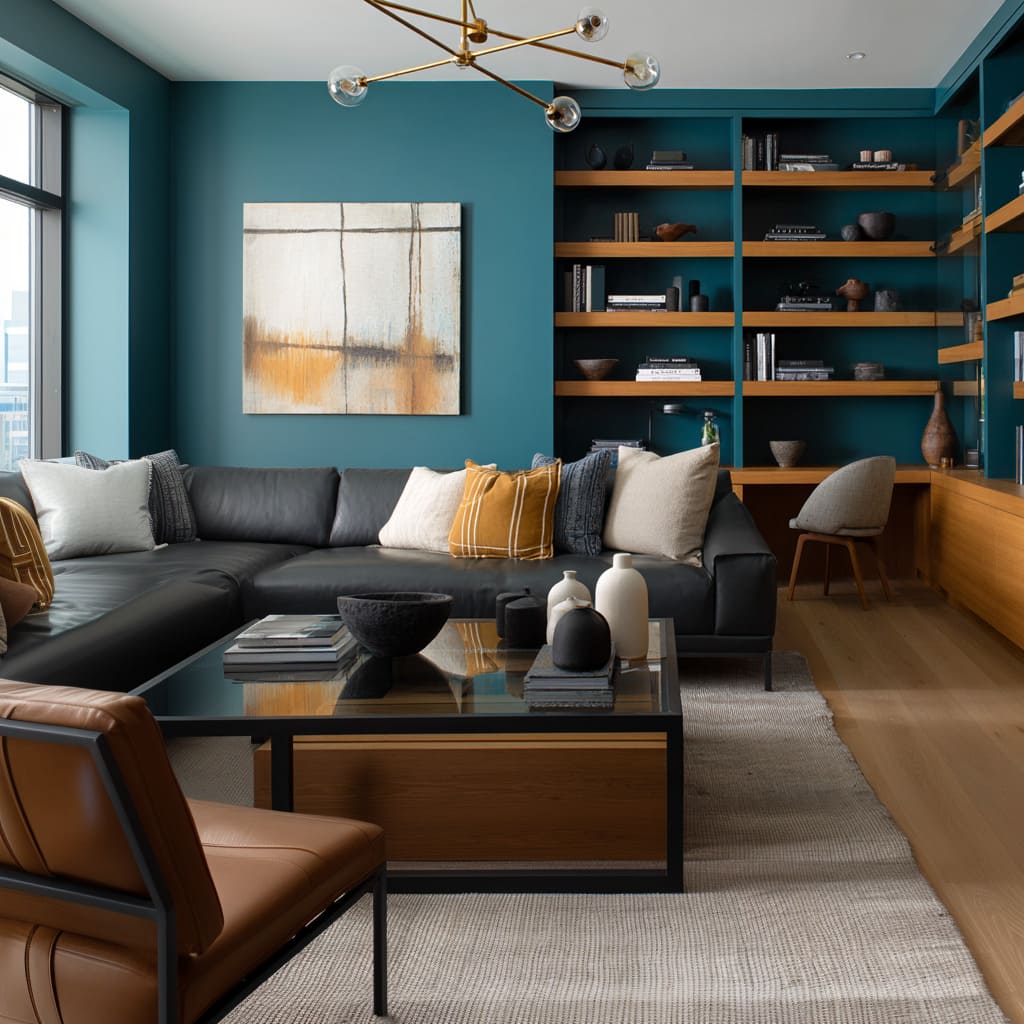 This is why a living room with dark grey couch can handle a teal built-in wall or deep blue-green paint: the teal acts like a controlled filter, while wood shelving and warm metal lighting add a measured counterweight. The grey stays clear because it isn’t asked to compete with too many strong undertone signals at once.