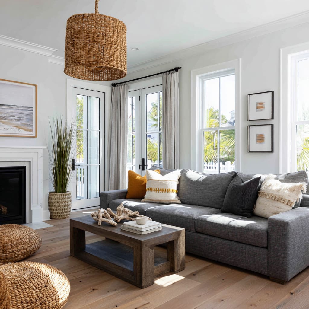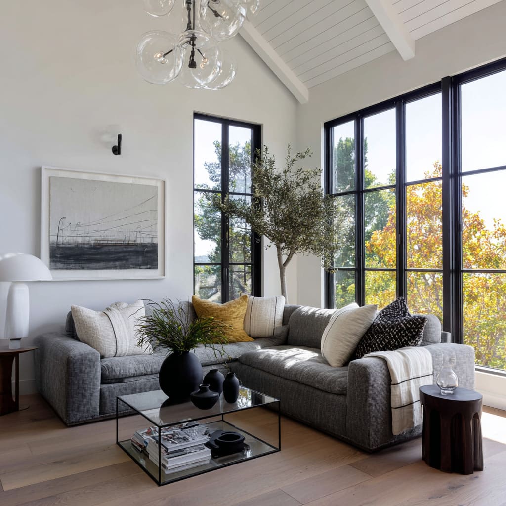 - A tall vertical element that pulls the eye upward (a slim lamp, a tall plant, or a vertical slat feature)