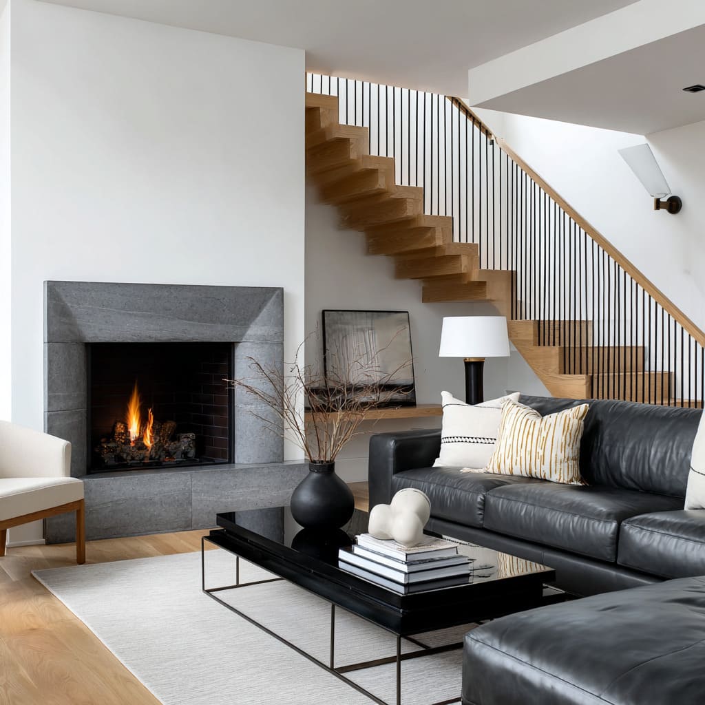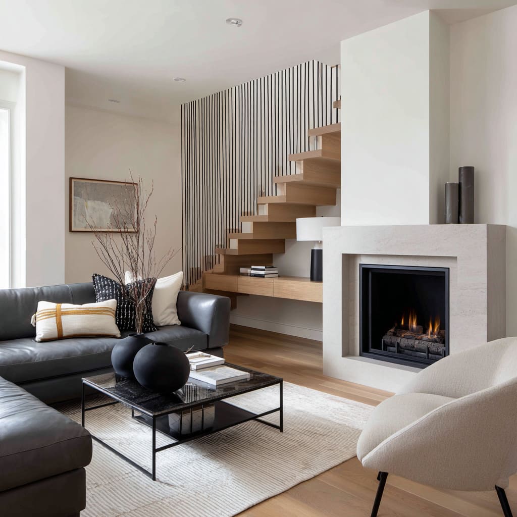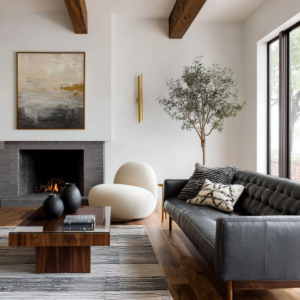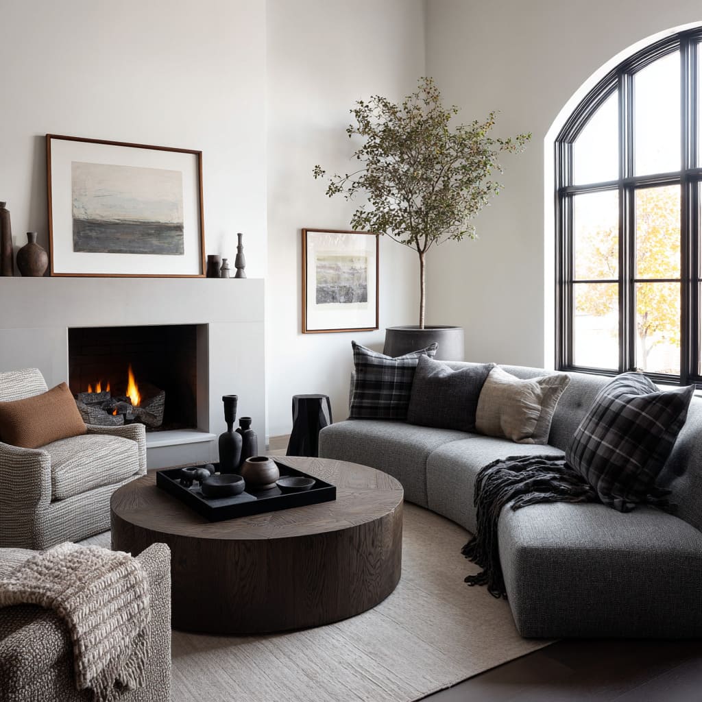 A third cue is silhouette variety without clutter. Rectangles (sofa, fireplace box, rug) feel calmer and more premium when one or two rounded forms interrupt the geometry: a curved chair, a drum table, rounded vases, or tall branches that pull the eye upward.