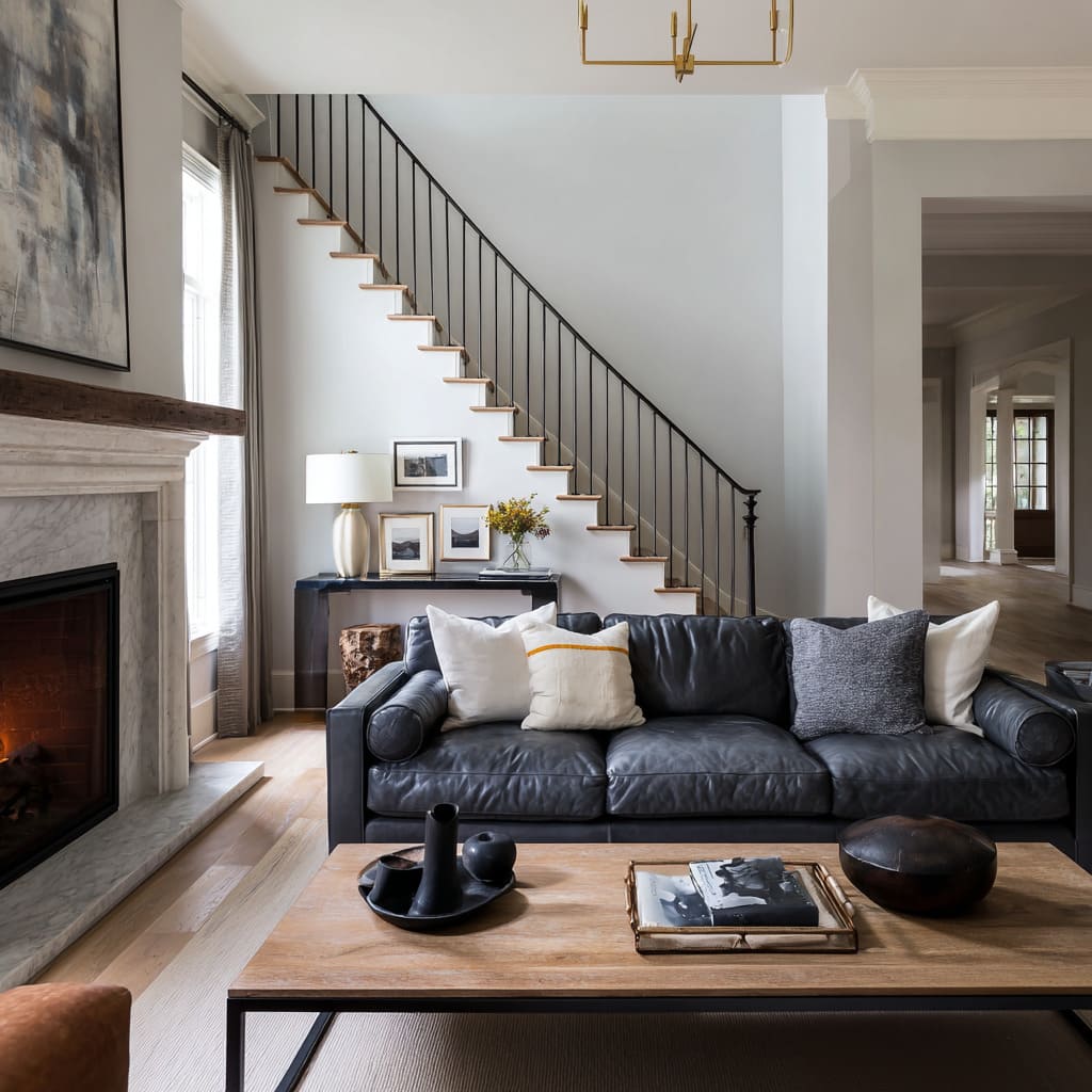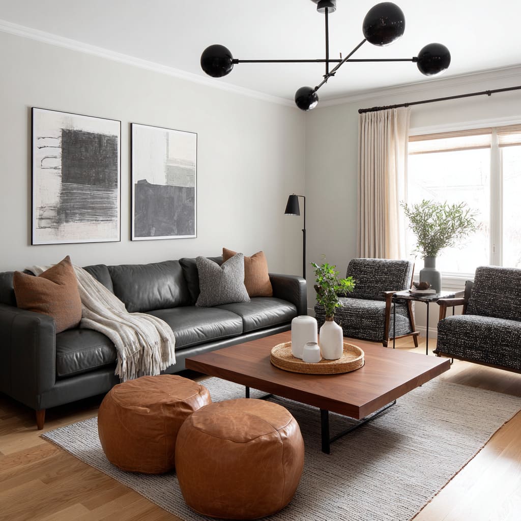 A dark sofa looks too dominant when it is the only strong material. In the most layered designs, the sofa participates in a conversation:.