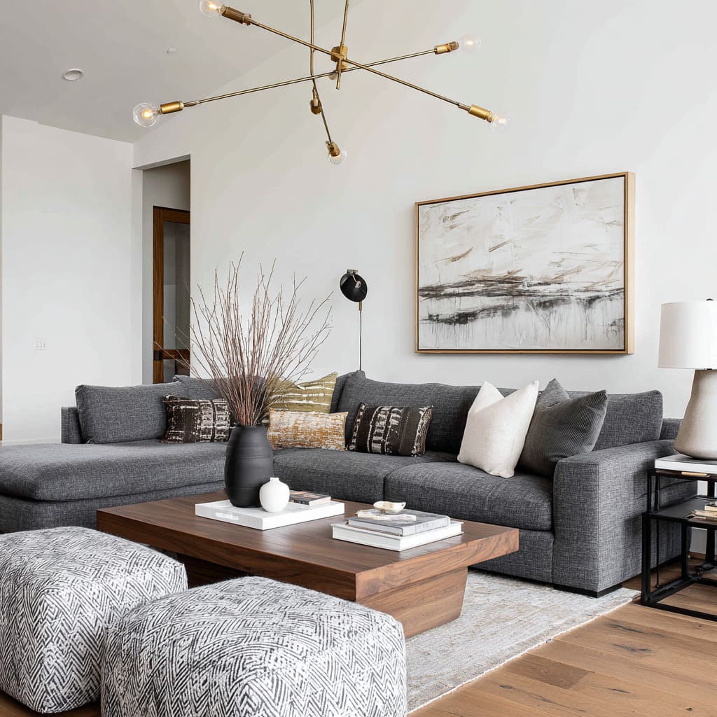 This logic explains why dark grey sectional living room ideas can feel lighter than a smaller sofa: the sectional can be big, but the eye still finds breathable edges, a clear floor boundary, and a center that doesn’t turn into a dark rectangle.