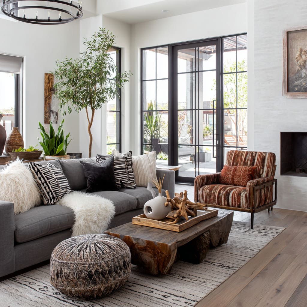 - Touch warmth (hand-height): warm wood on a coffee table top, a walnut tray, or a side table that sits close enough to read as part of the seating “bundle.”