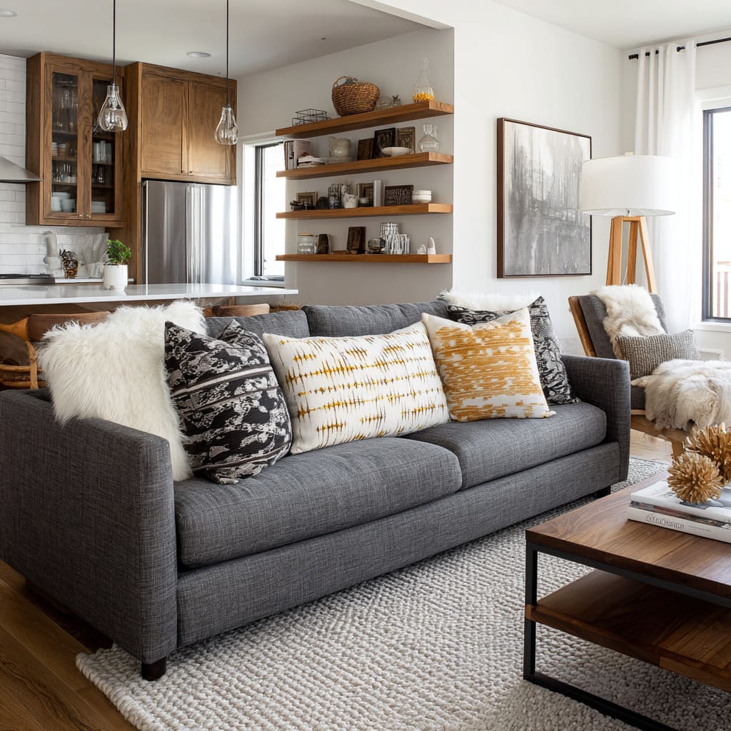 These moves add life without adding more colors. They’re especially effective in dark grey couch interior design, where the sofa’s seriousness can otherwise make the room feel too formal.