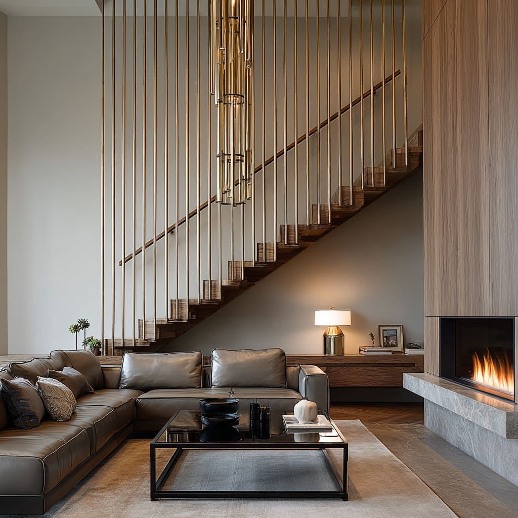 The darkness stops being “one big heavy thing” and becomes a rhythm. Warmth then shows up as a measured counterweight (oak treads, walnut table, brass glow), placed in a few strong locations instead of spread everywhere.
