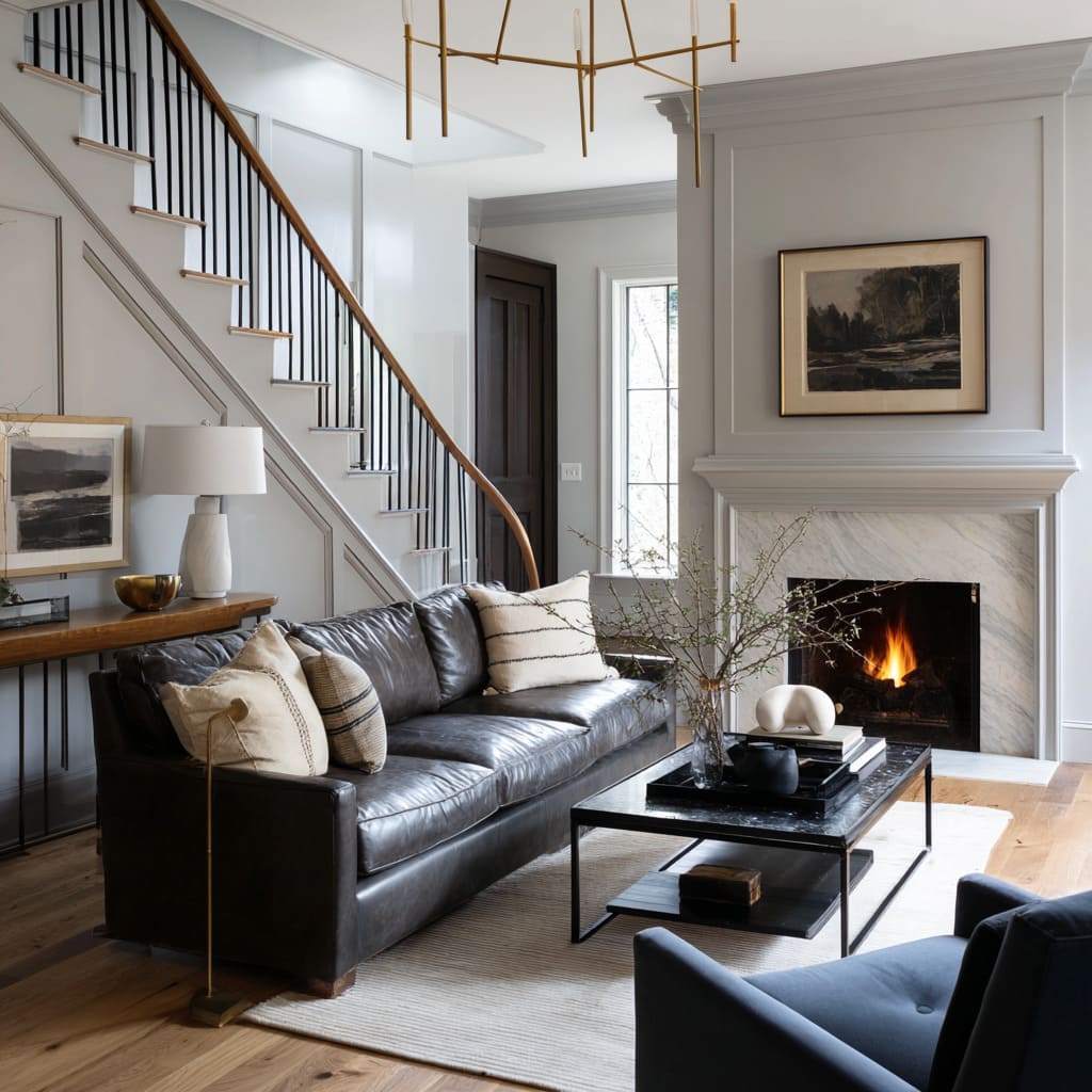 - Line-forward rooms: black window grids, linear chandeliers, rectangular tables, straight sofa arms create a crisp, clean mood that suits leather and charcoal