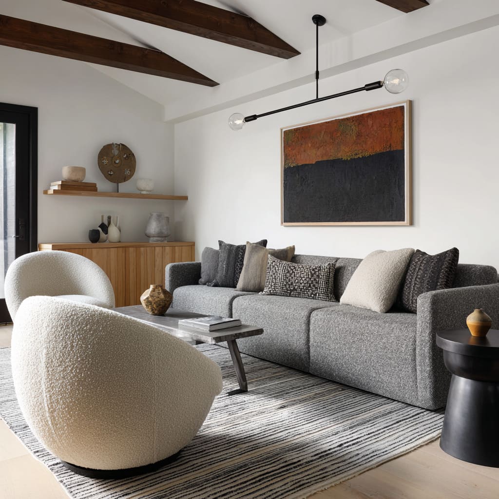 It’s the same reason sculptural cream chairs make a deep charcoal sofa feel softer—large light shapes change the emotional temperature without adding new colors.