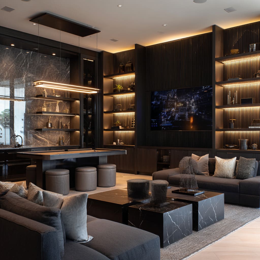 Stone counters within shelf systems act as game tables or display areas. Chess boards, minimal sinks, and sculpture-filled shelves add layers of use without interrupting the moody tone.