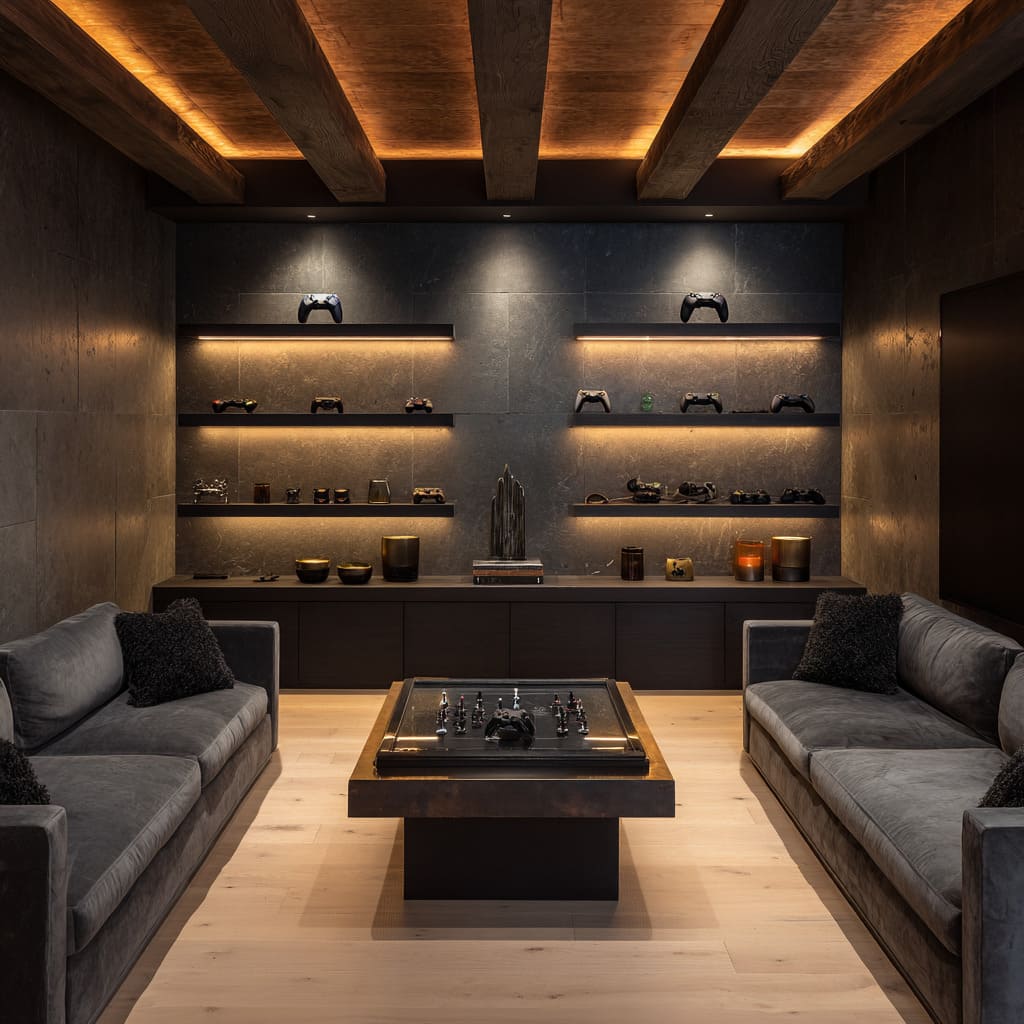 Lighting in such designs rarely shows its source. Instead, the effect appears through glows, halos, slots of warm light, and hidden reflections that move gently over stone, wood, and metal.