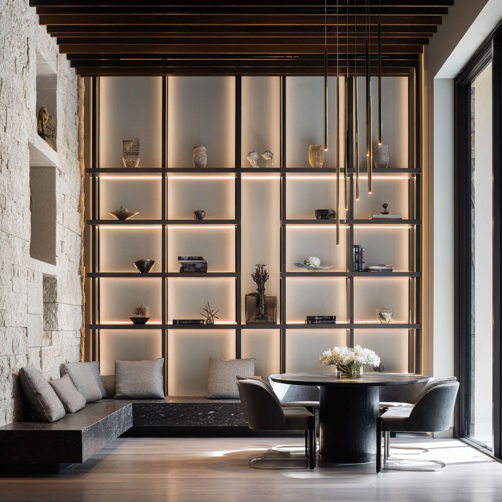 Narrow vertical strips inside ribbed walls act like glowing lines that break darkness with softness, while shelf backlighting forms a faint aura around sculptural objects. Under-lit consoles add a floating quality, and ceiling beams with hidden lighting create large shadows that shift throughout the day.