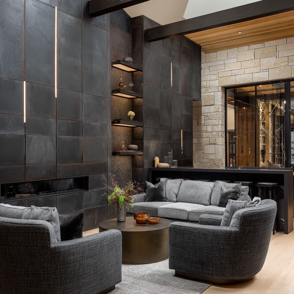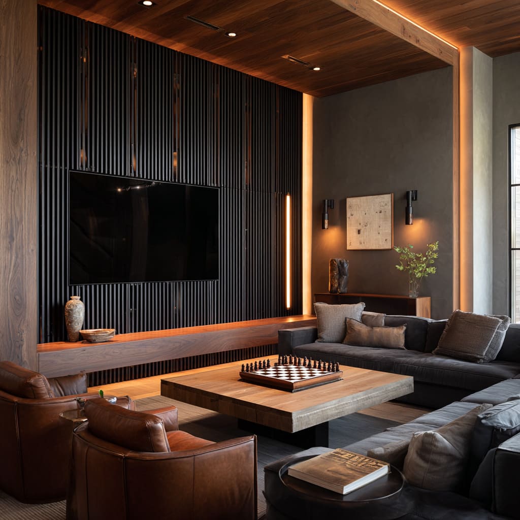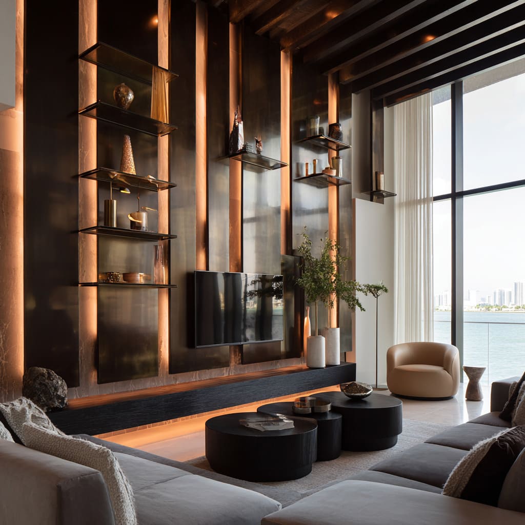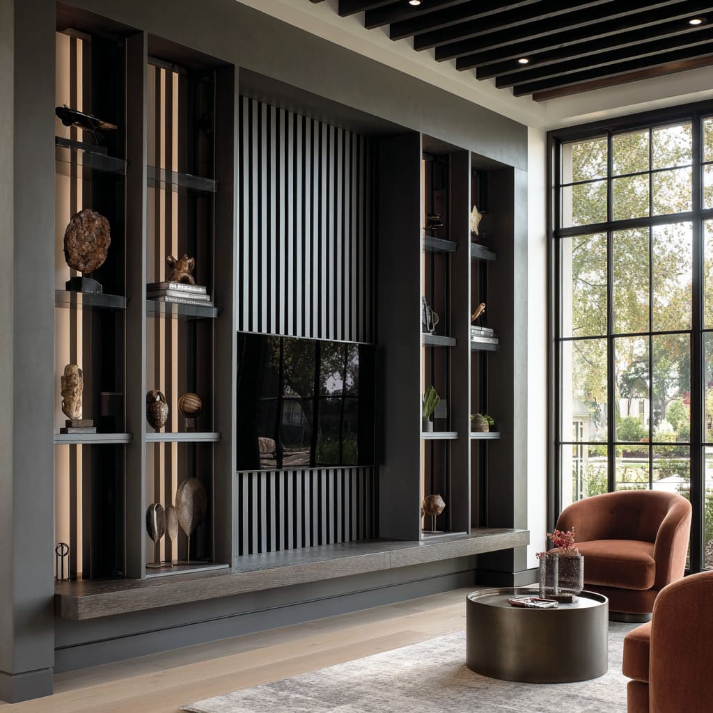 This method supports moody living room ideas by showing how shadow can communicate structure. Designers often pair these vertical systems with long horizontal elements—a floating bench, a stone ledge, a full-length console—so the eye settles into a stable visual base even while the walls reach upward with layered detailing.