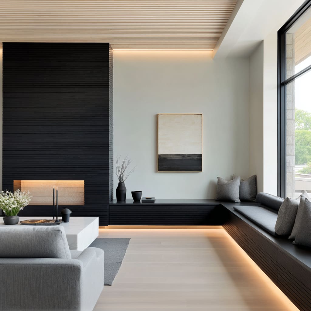 Taken together, all these strategies form an emotional ecosystem defined by calm shadows, layered textures, measured compositions, and a strong sense of intention. Each gesture—curved seating against strict ribbing, glowing lines against dark stone, warm shelves inside deep niches, sculptural objects with soft silhouettes—adds another layer to the room’s personality.