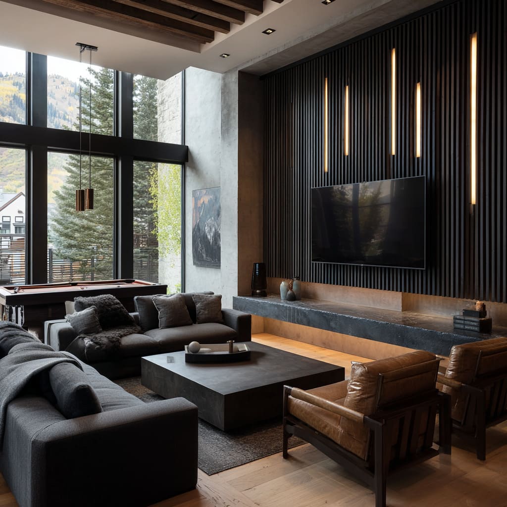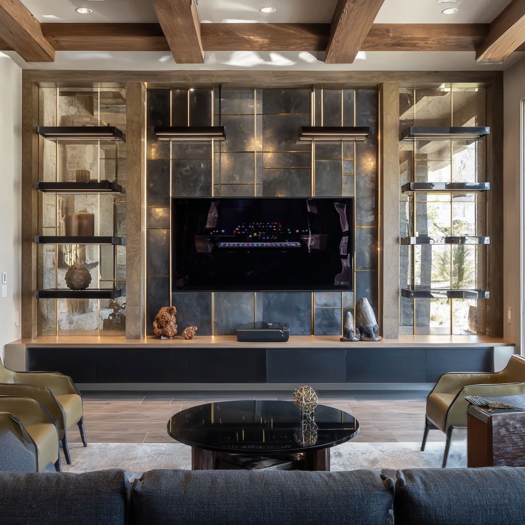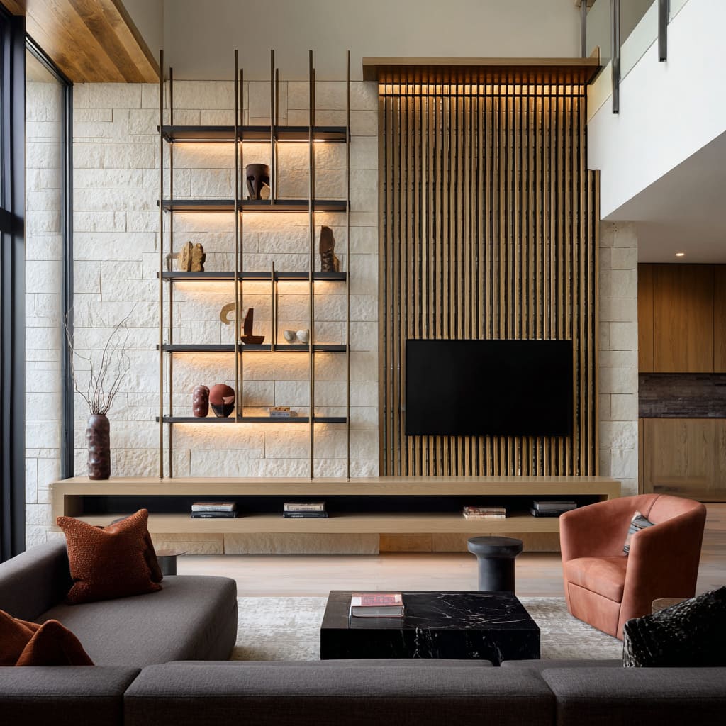 A recurring motif is the “stage wall,” where a TV, fireplace, or lit grid becomes the focal zone. Such walls are framed with ribbed surfaces, metal panels, stone slabs, or illuminated niches, each method acting like an architectural proscenium.