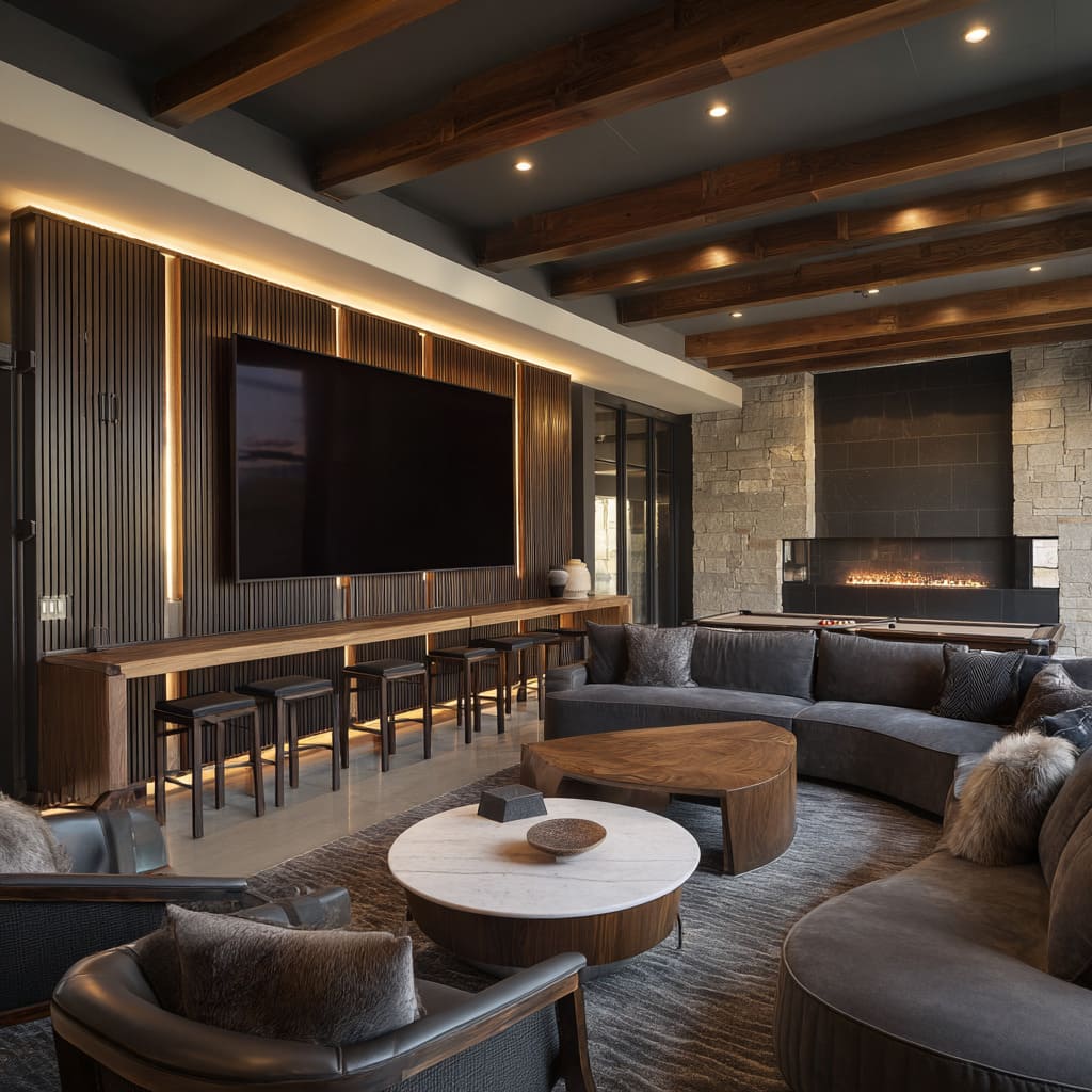 Many designs blend traditional living room roles with secondary functions, forming hybrid spaces where evening activities feel natural and cohesive. A long wood counter may maintaining the same palette as the seating area.