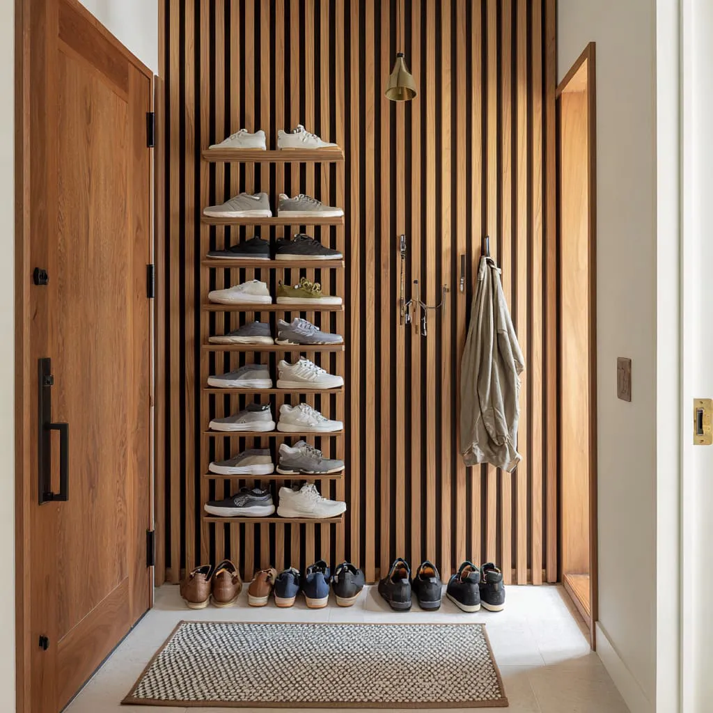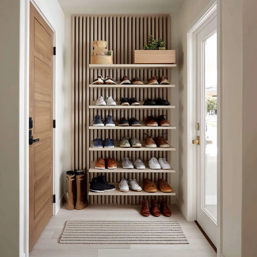 Behind-the-door vertical slat wall with floating shelves that turns a narrow corridor into a disciplined shoe gallery