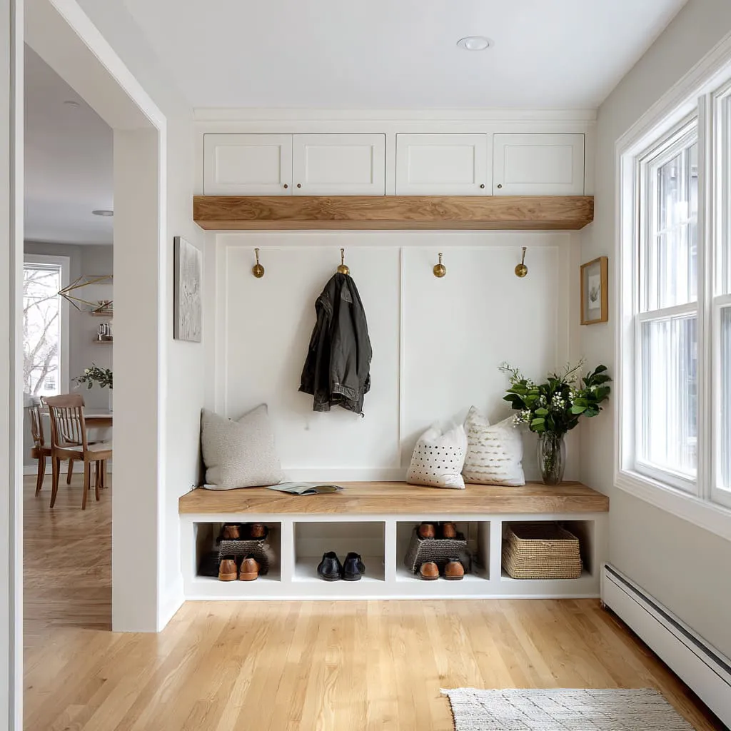 • Corners that can become a destination: wrap-around bench/hook/tall cabinet unit, corner banquette with boot bay, curved corner cabinets. Corners stop being dead zones when the storage has a clear purpose.