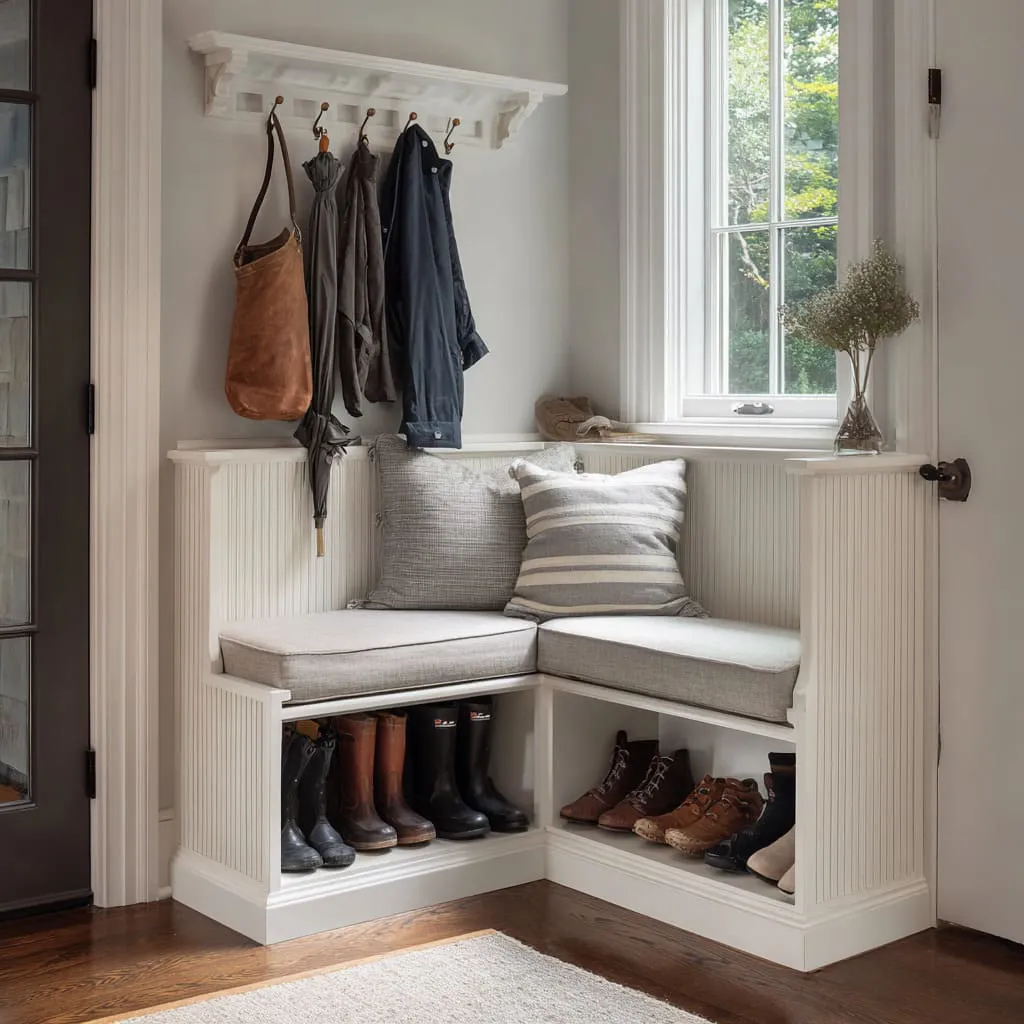 Corner banquette entry nook with wrapped wainscot look, a defined boot bay, and a comfort-first shoe ritual