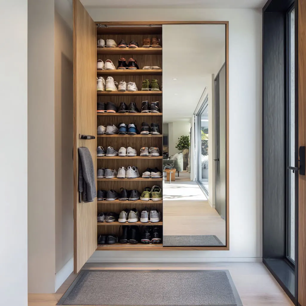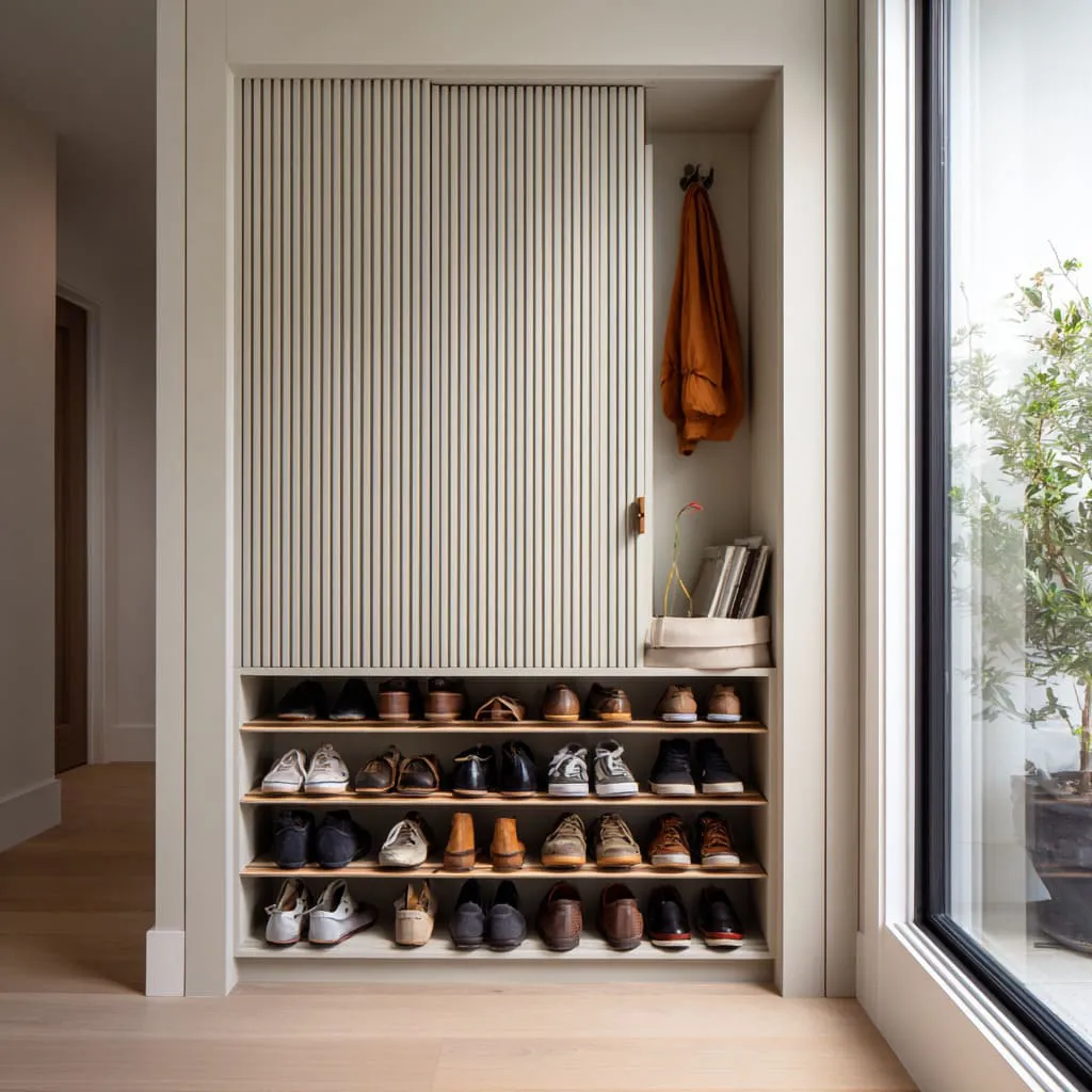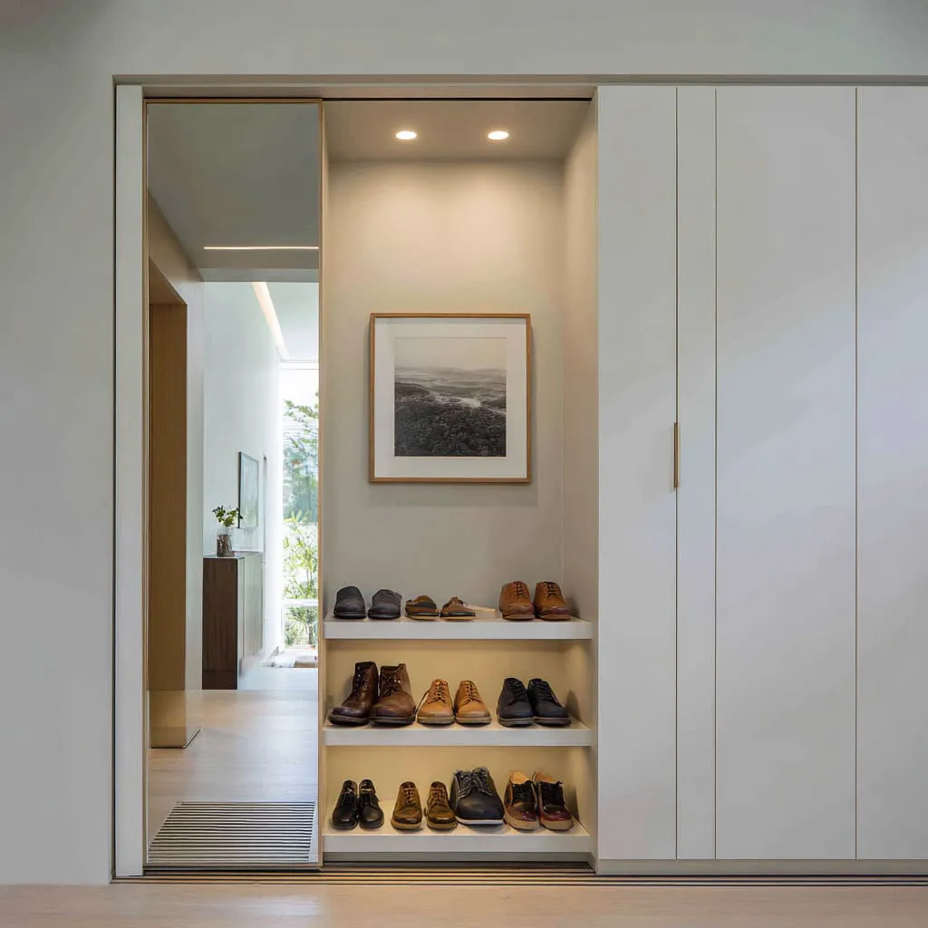 • Shoe storage gets treated like part of the wall (or a built-in composition), not an afterthought.