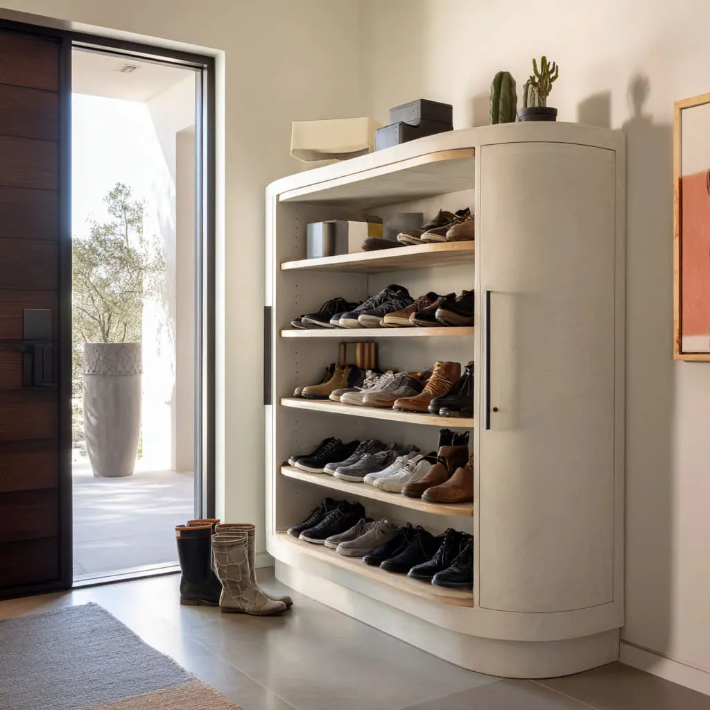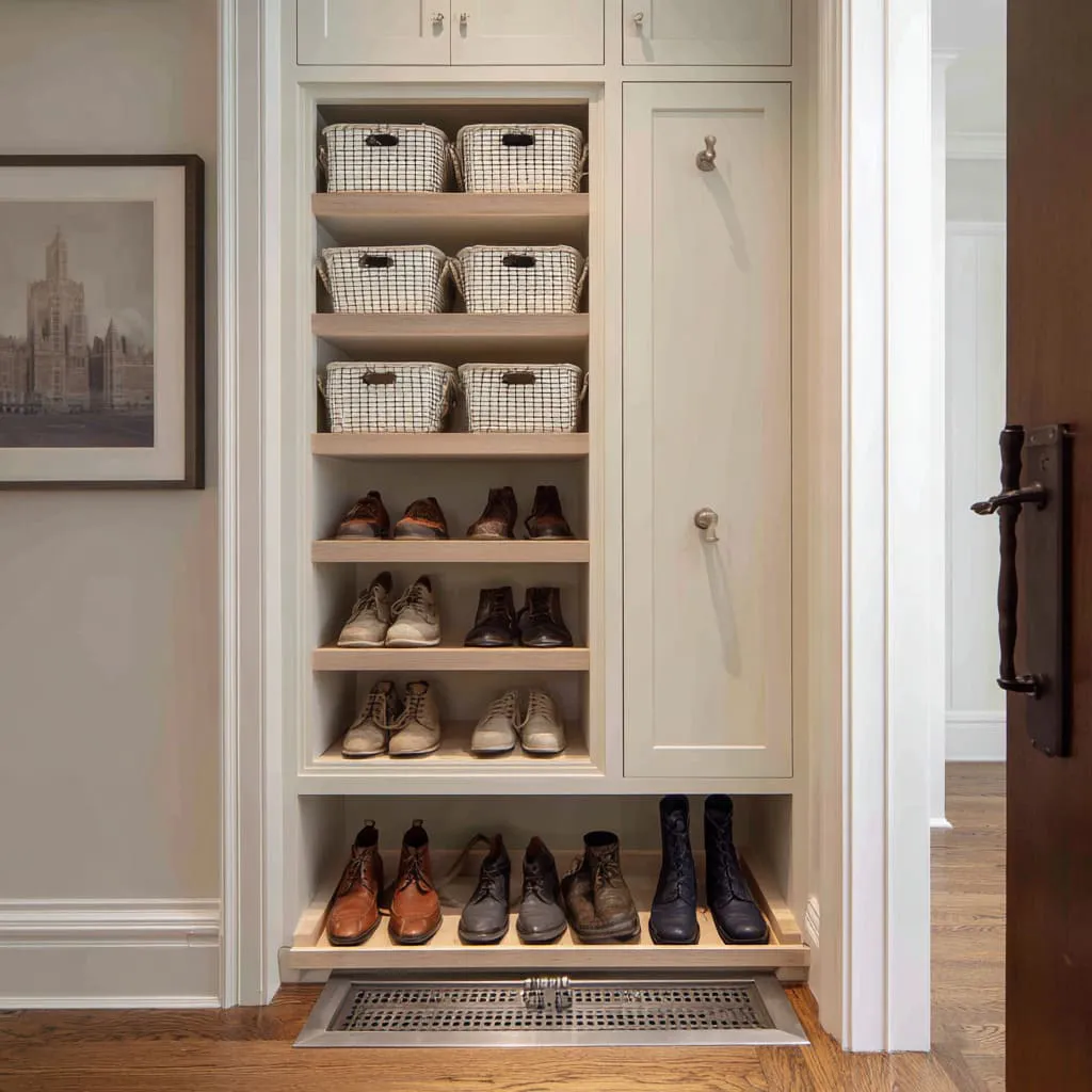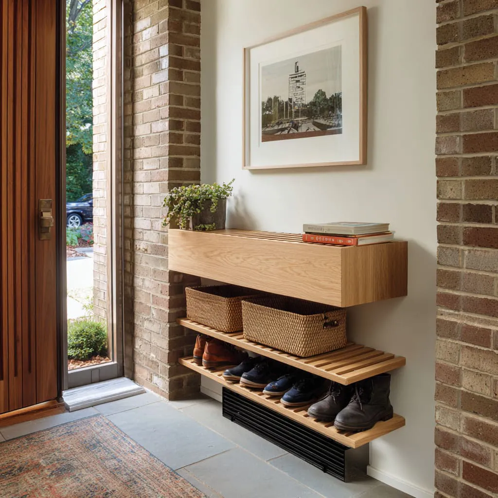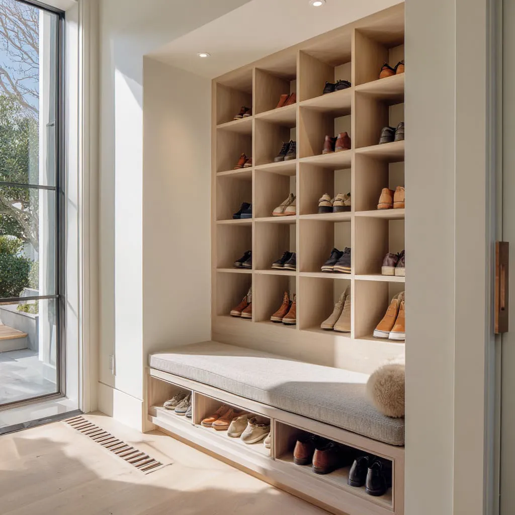 • Shoe storage gets treated like part of the wall (or a built-in composition), not an afterthought.
