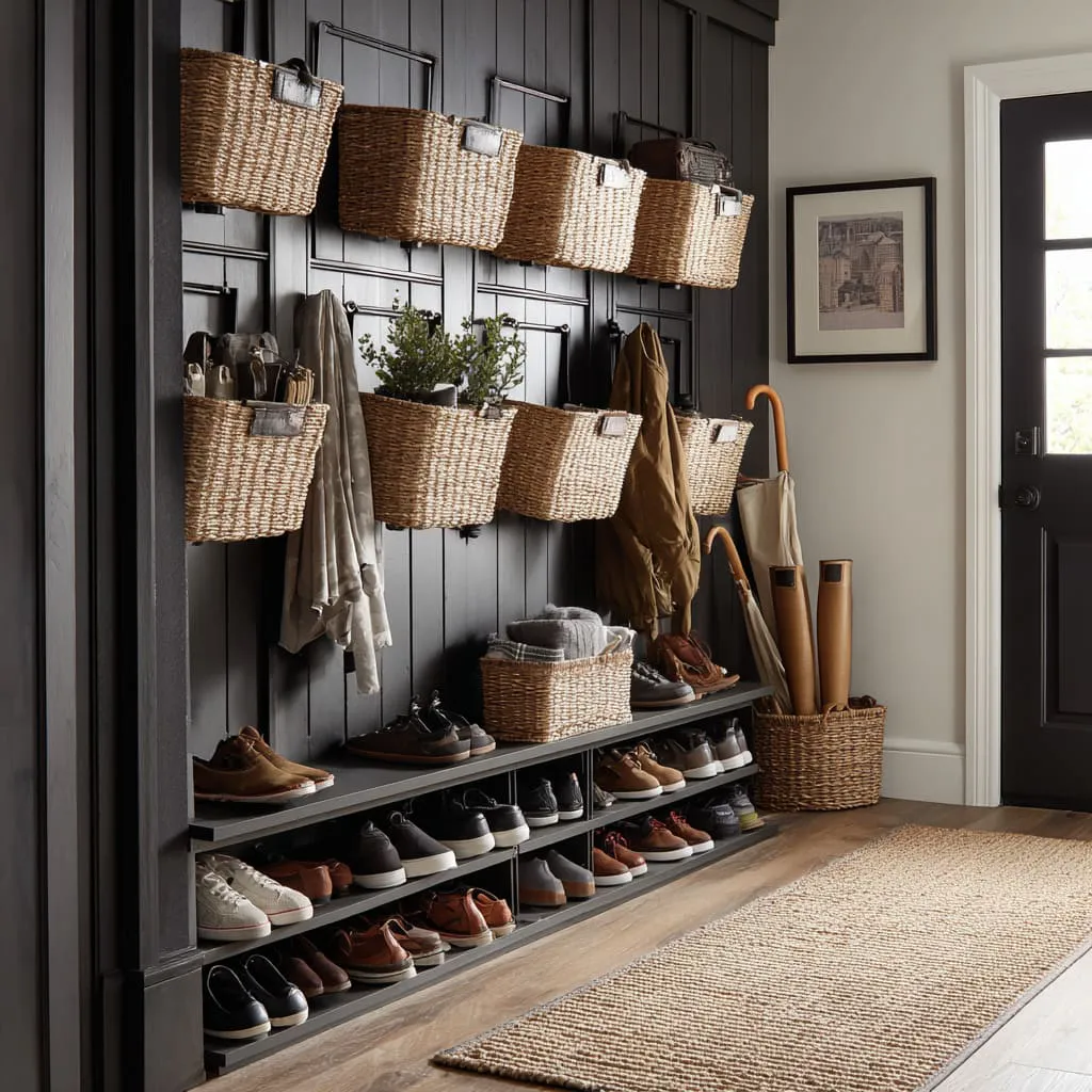 A dark paneled wall is also a smart move in a shoe-heavy entry: dark background + woven baskets makes visual clutter less loud, while textures still feel rich.
