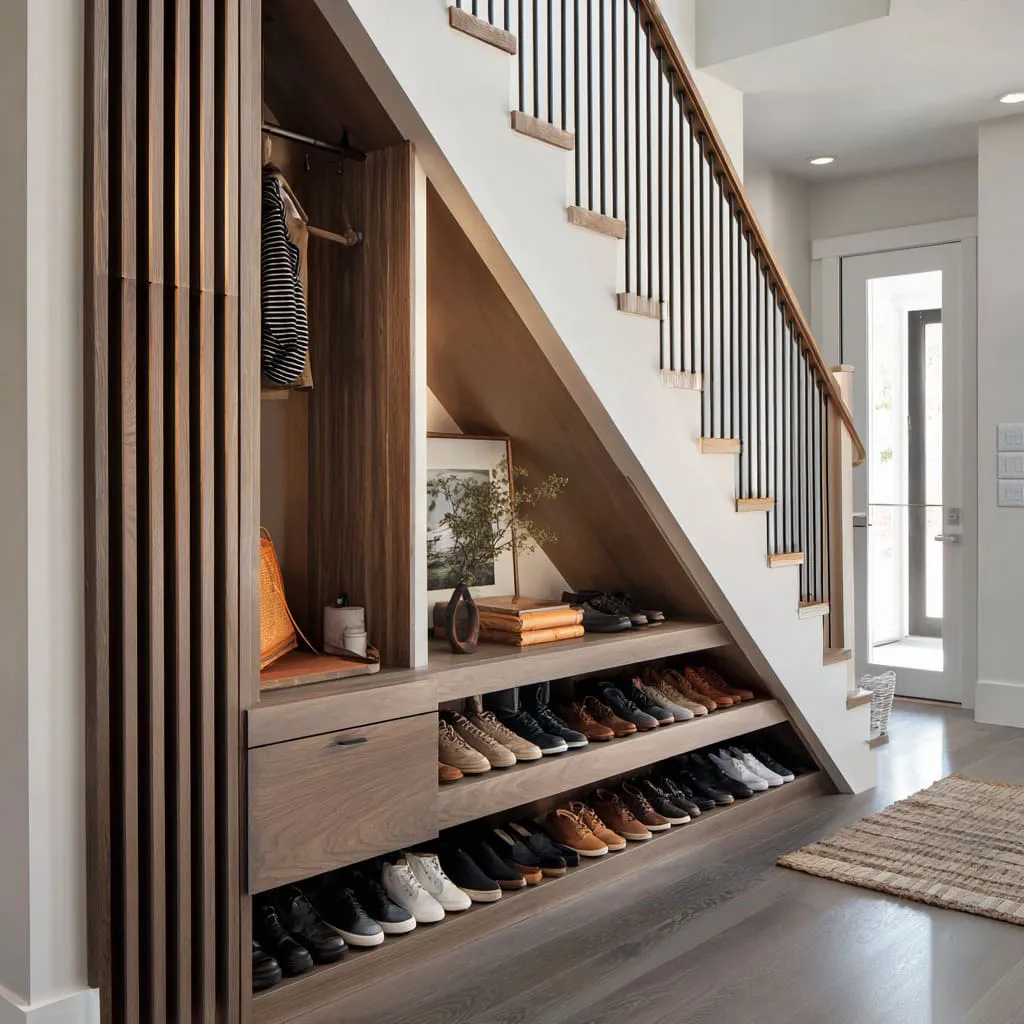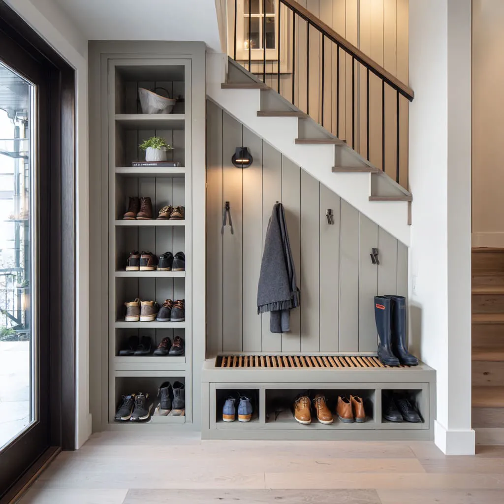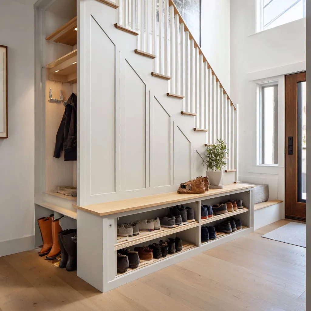 Small entry build with a under-stair bench stage, tall shoe library, and a hook field