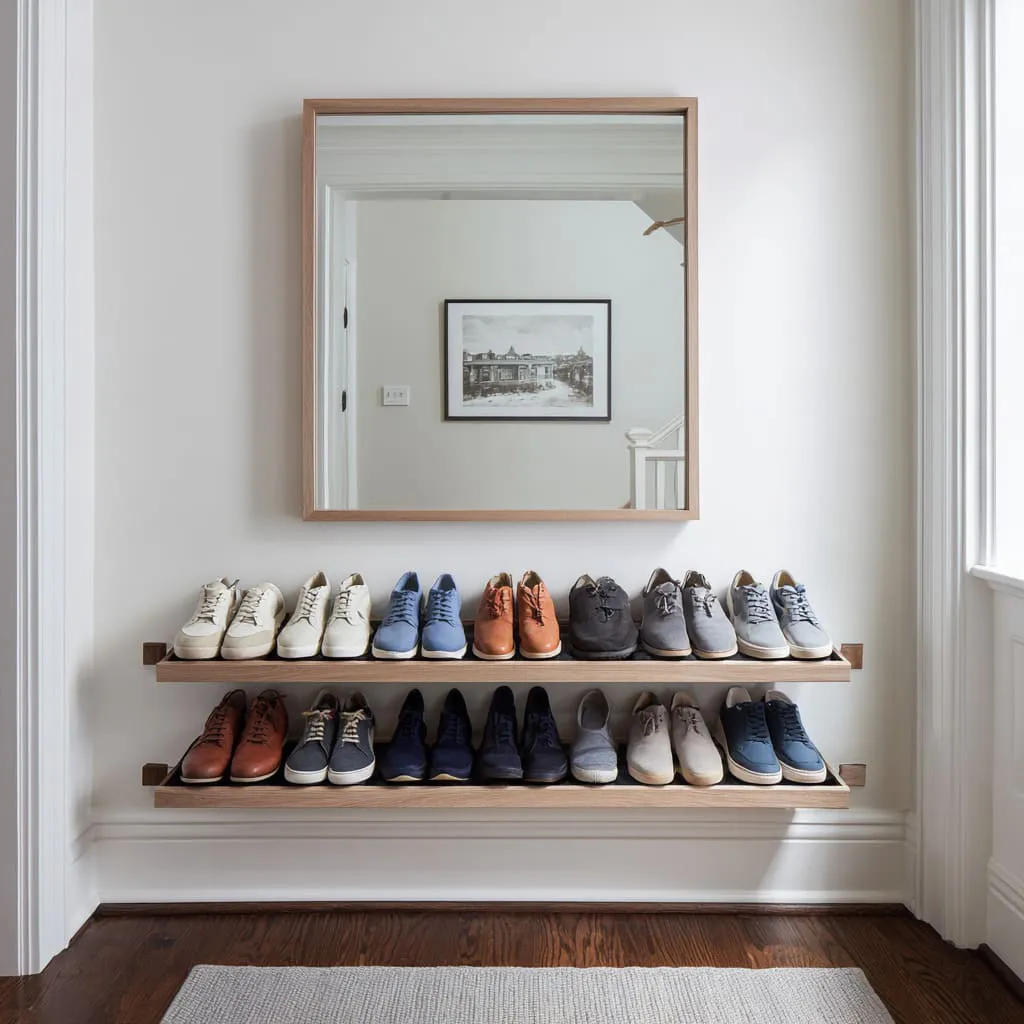 Two-tier shoe ledge with mirror wall that turns daily footwear into a calm, controlled display