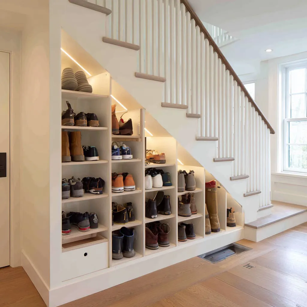 Under-stair cubby wall with warm line-lighting and mixed shoe geometry zones