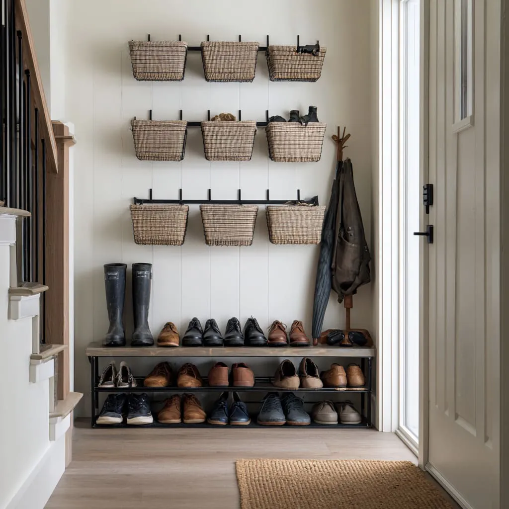 Dark paneled wall with low shoe rail, hanging baskets for categories, and a layered daily routine that prevents entryway clutter