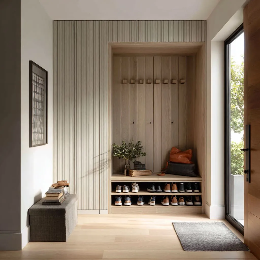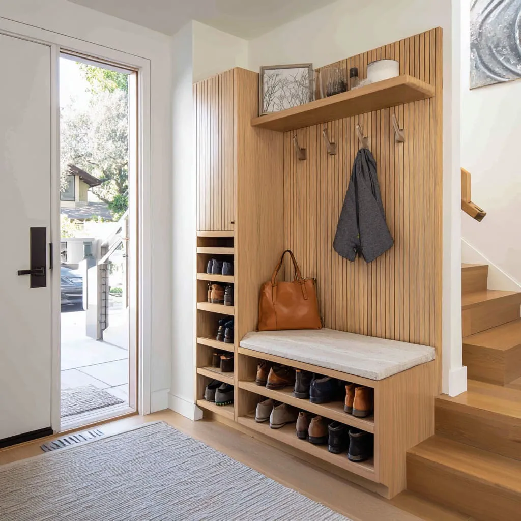 Vertical slat feature wall with floating shoe ledges and a clean landing zone, a small entryway that feels like a calm gallery wall