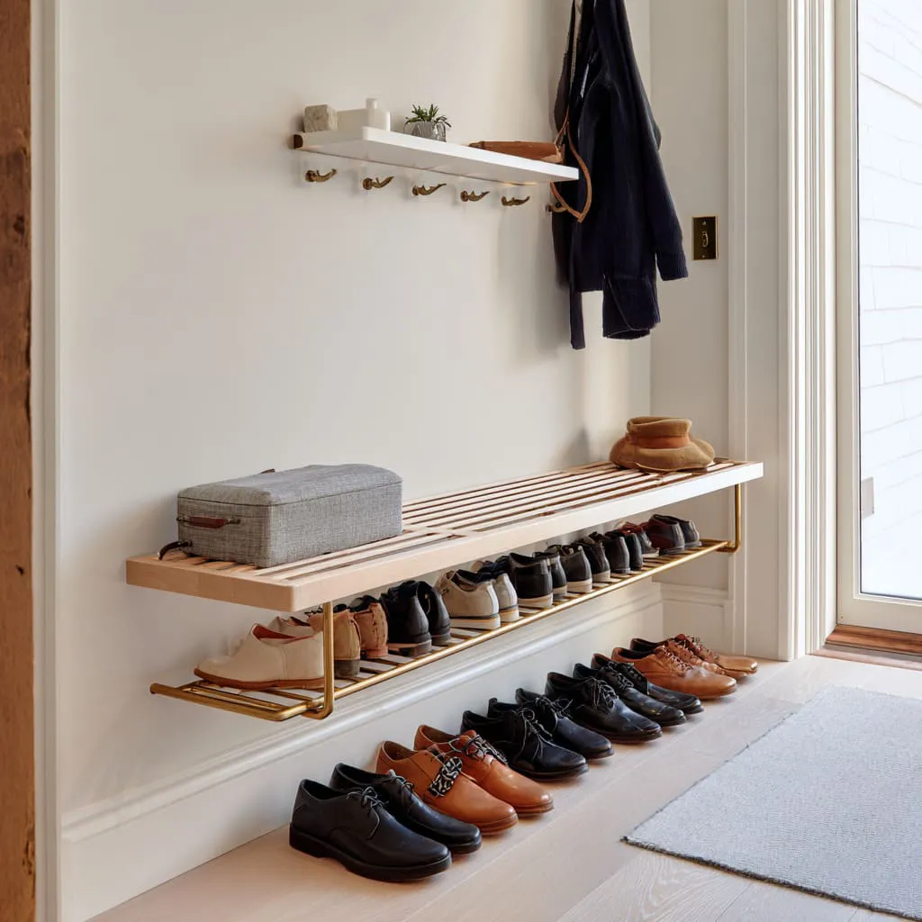 mounted slatted bench with brass rail shoe shelf and slim hook ledge above