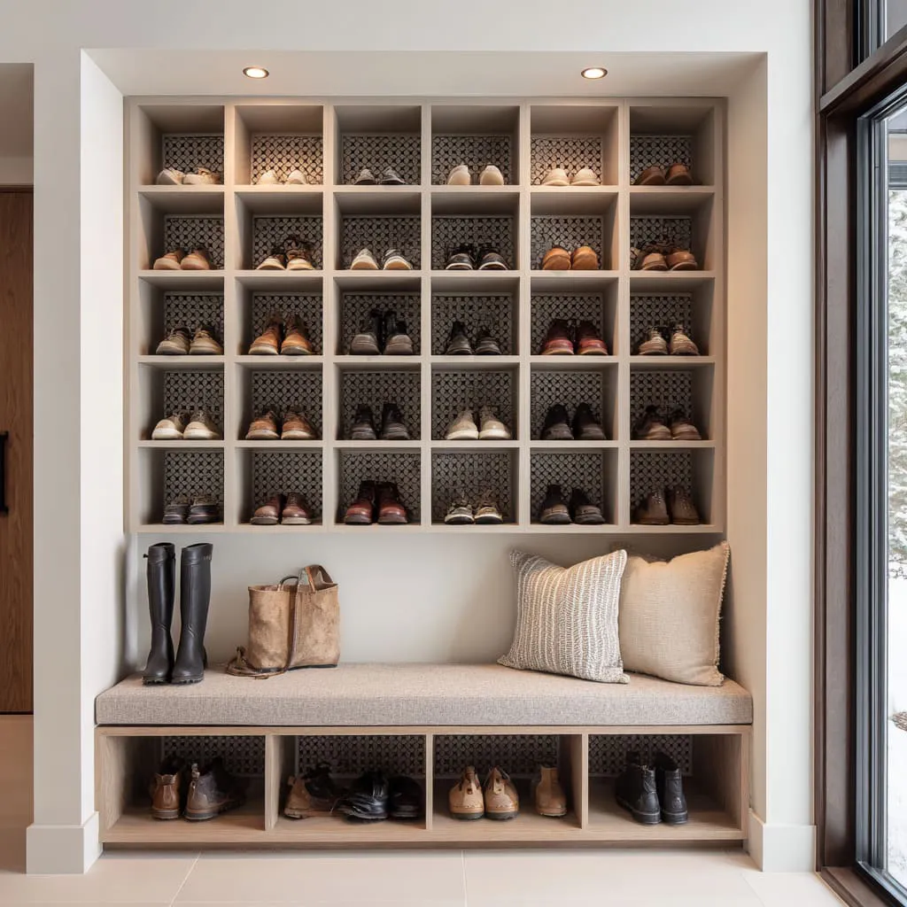 shoe-grid wall with patterned backing and a soft bench for a calm entry lounge