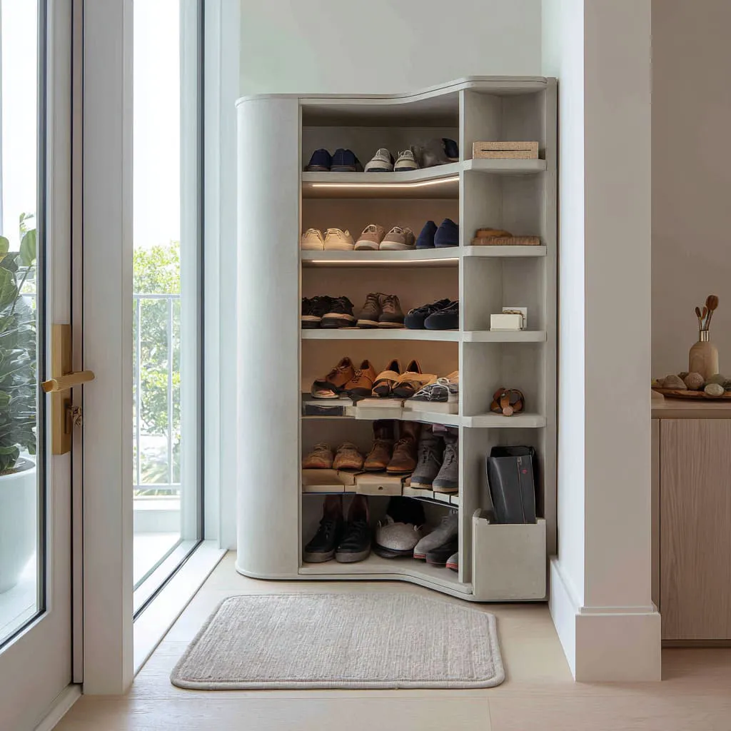 Curved corner cabinet that treats shoes like a soft wrap-around library