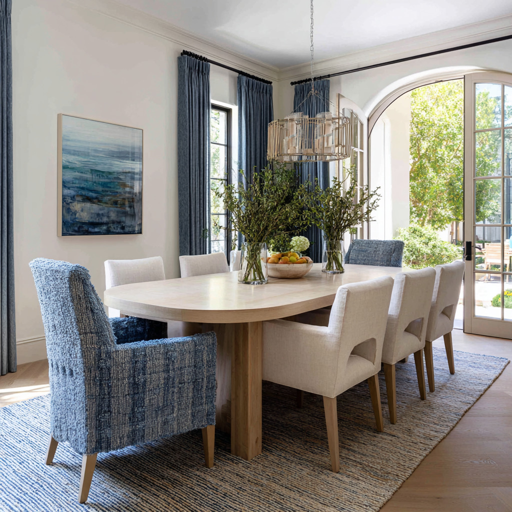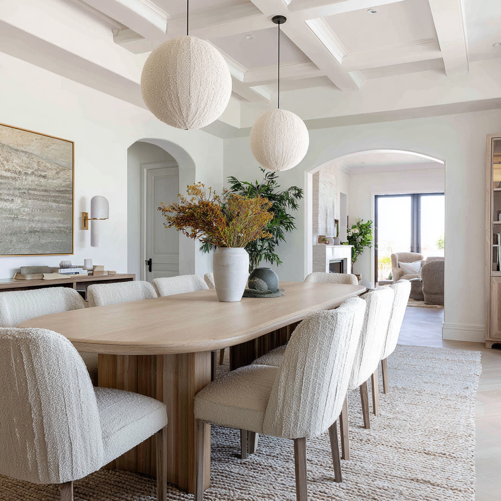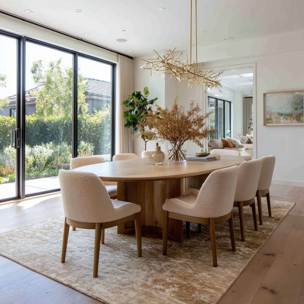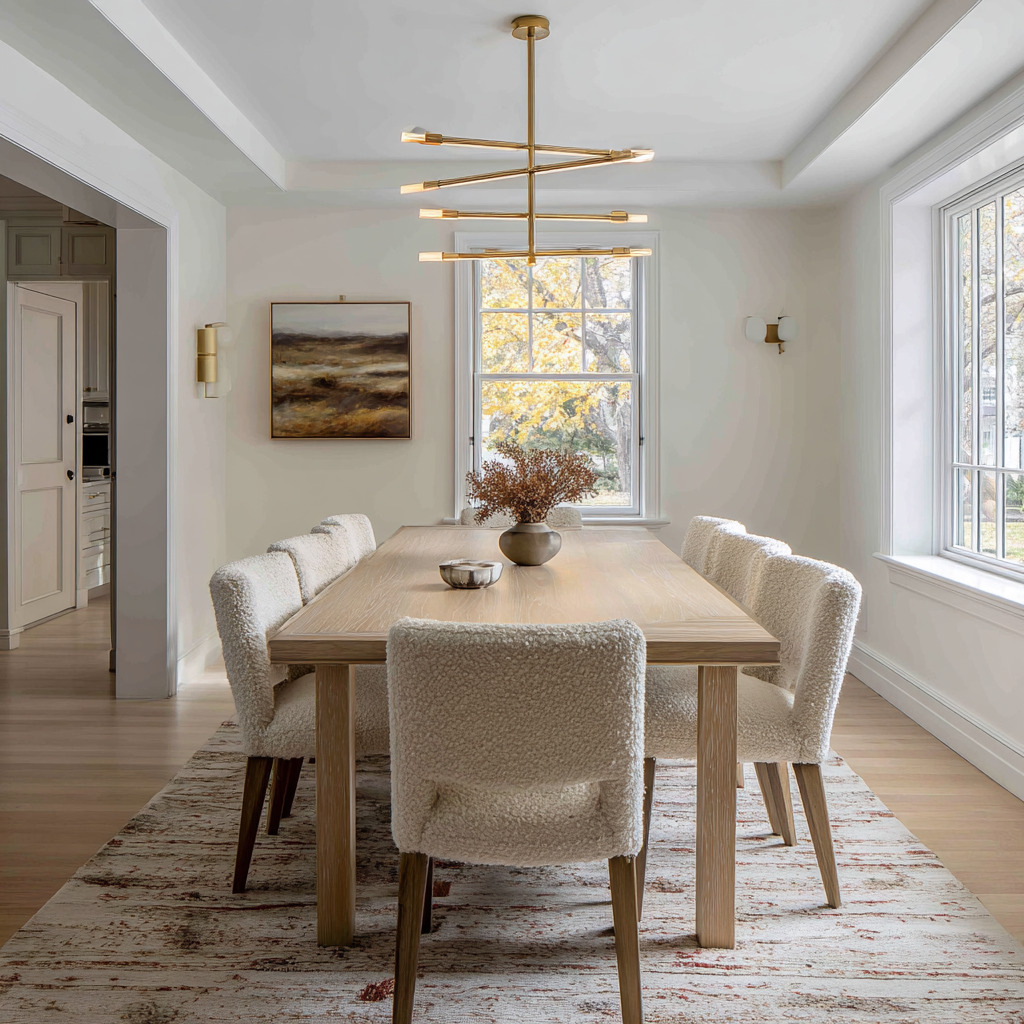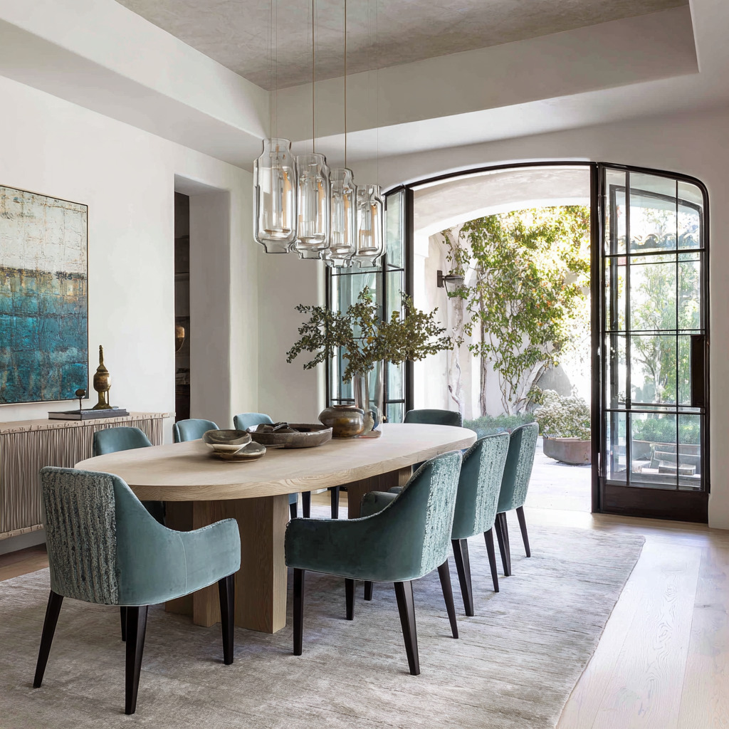 - Choosing a formal table + formal light, then leaving the perimeter blank (no sideboard, no art, no drapery), which makes the room feel unfinished.