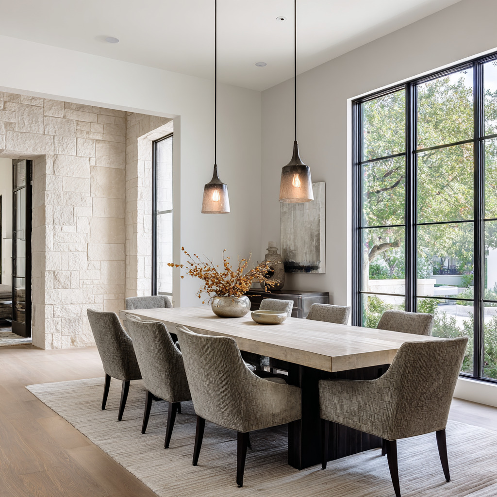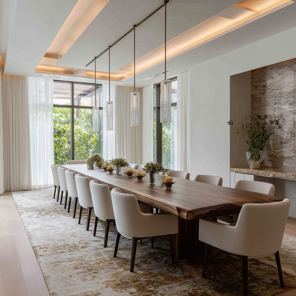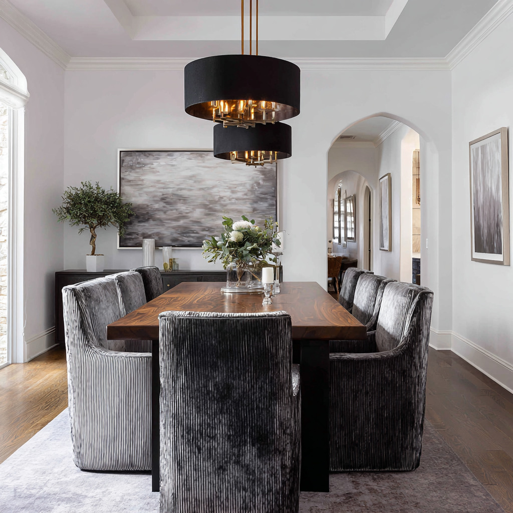 A formal dining room reads “occasion-ready” because the room has a clear order of attention: the table is the anchor, the lighting marks the center, and the perimeter stays edited so the main scene feels intentional. Formal doesn’t require heavy traditional details—your examples prove it can come from restraint, repetition, and material depth: one confident table plane, chairs that form a clean rhythm, and lighting that creates a flattering evening layer.