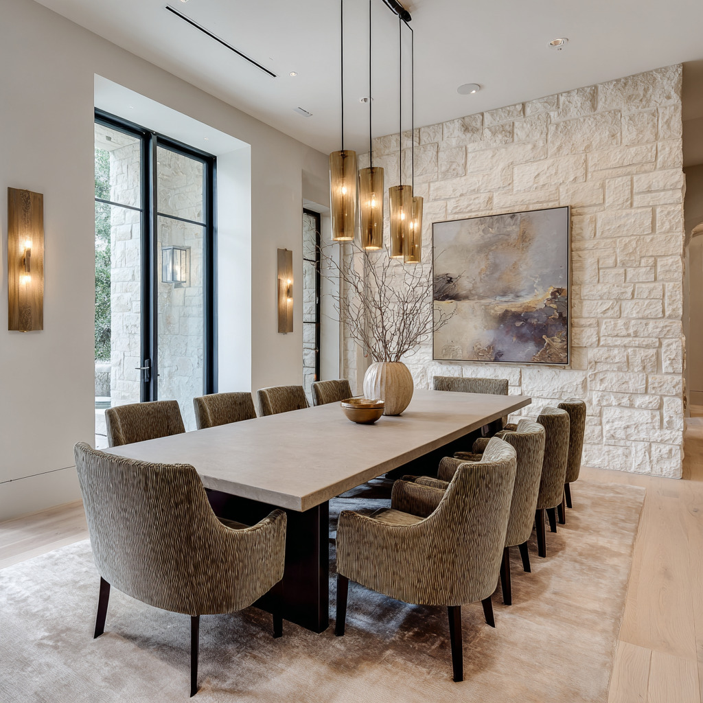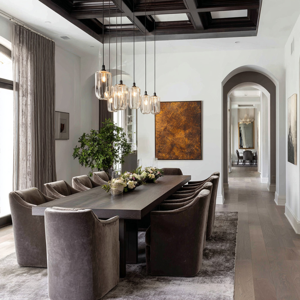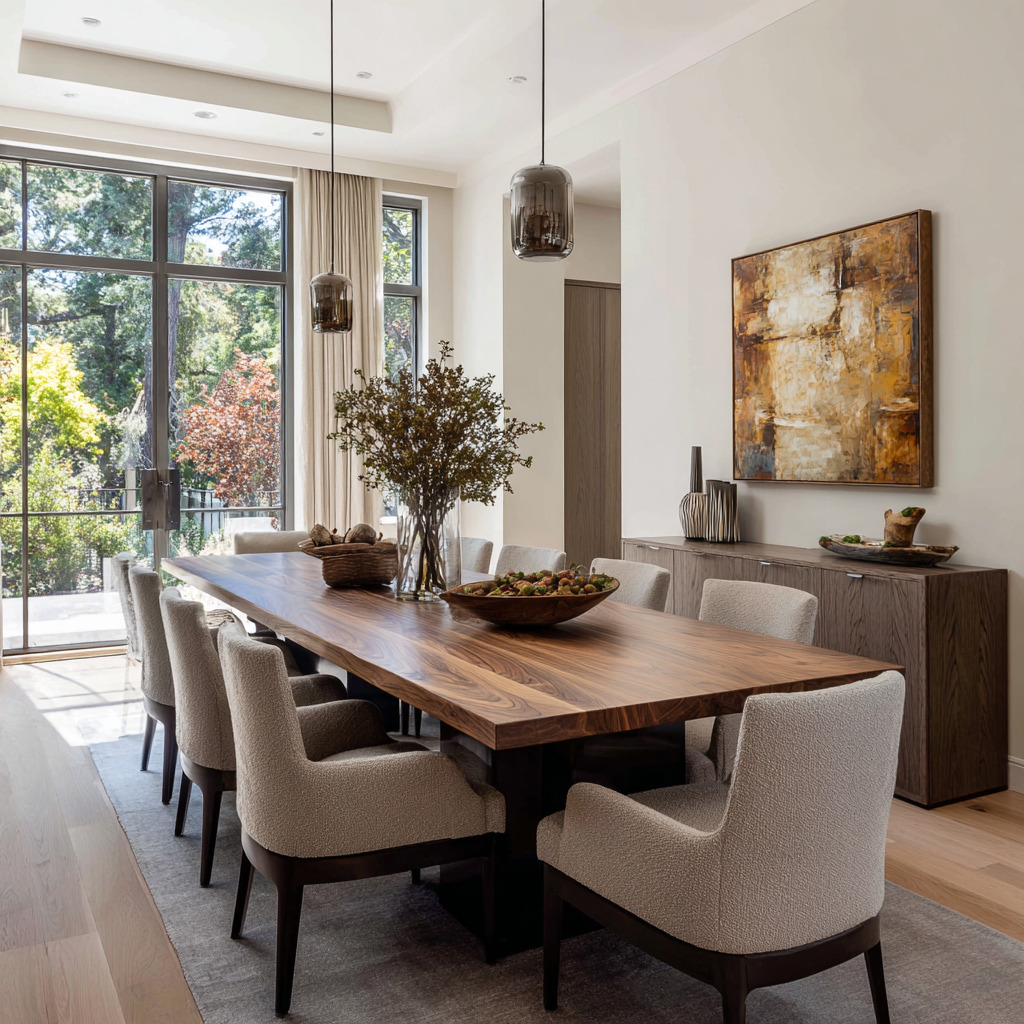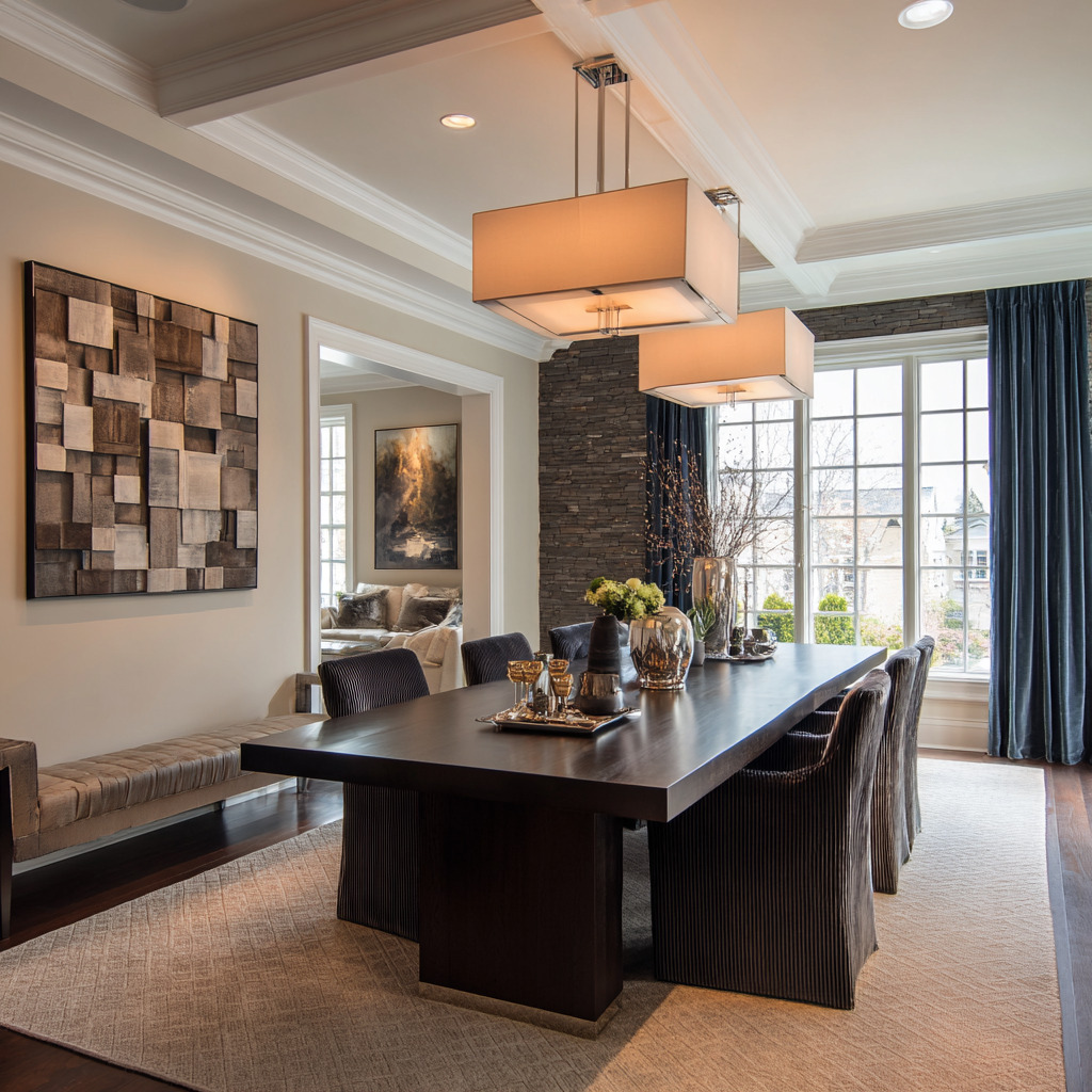 A formal dining room reads “occasion-ready” because the room has a clear order of attention: the table is the anchor, the lighting marks the center, and the perimeter stays edited so the main scene feels intentional. Formal doesn’t require heavy traditional details—your examples prove it can come from restraint, repetition, and material depth: one confident table plane, chairs that form a clean rhythm, and lighting that creates a flattering evening layer.