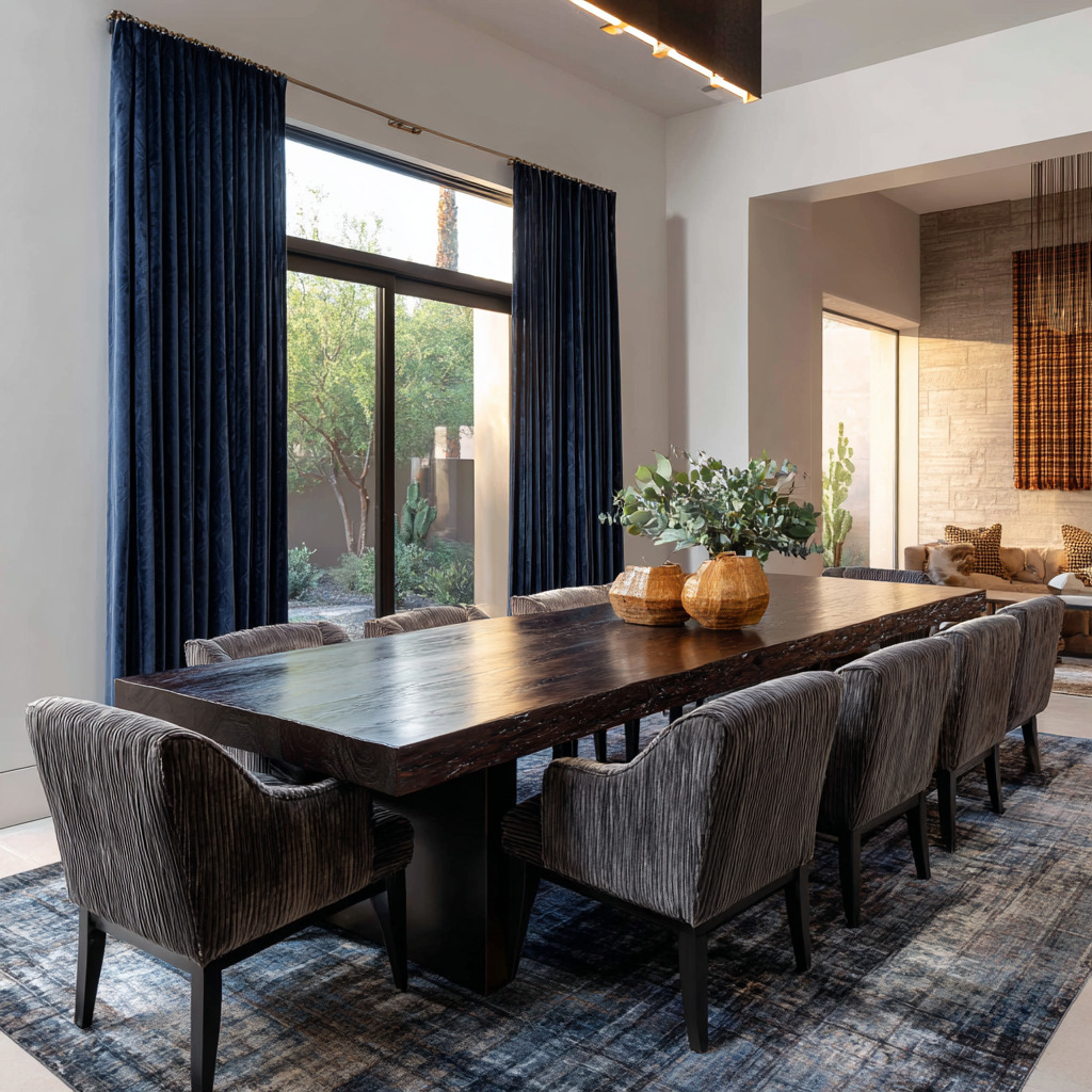 Deep drapery also acts as a mood tool: it visually narrows bright openings, which makes the dining table feel like the center of attention. This is one of the cleanest ways to create intimacy without adding objects.