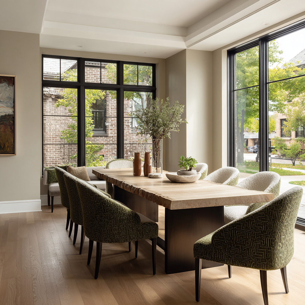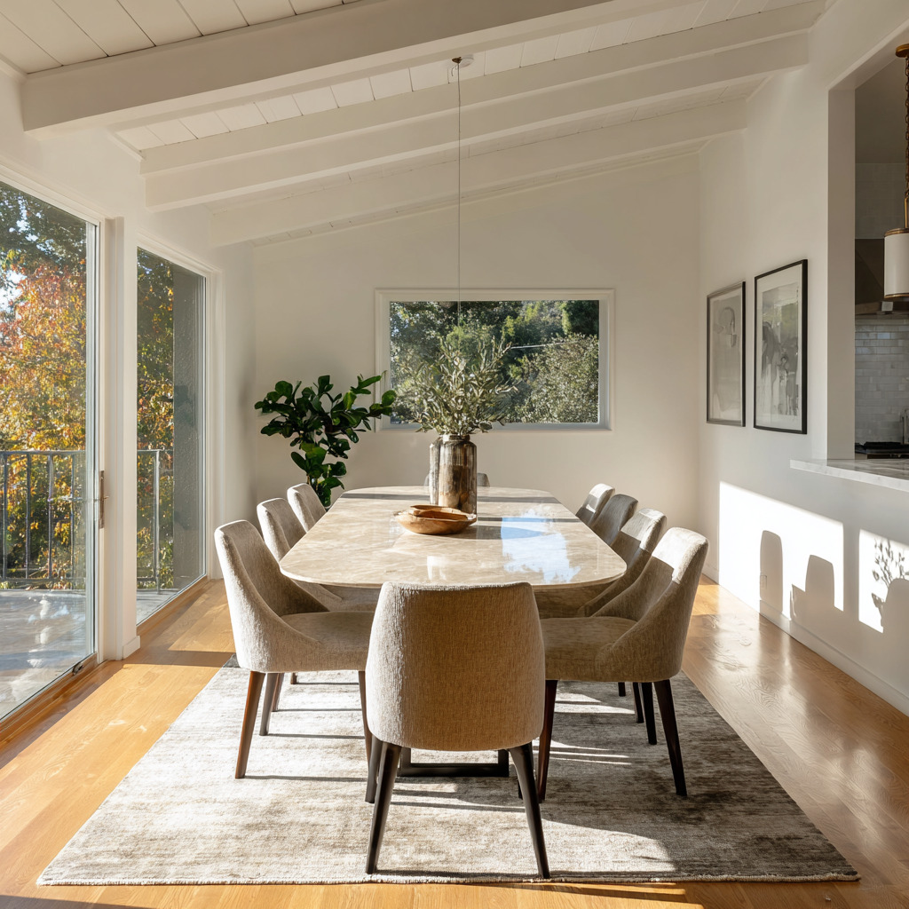 - An anchor: one dominant element that gives the room gravity (often the table plane, sometimes the ceiling, sometimes the window wall).