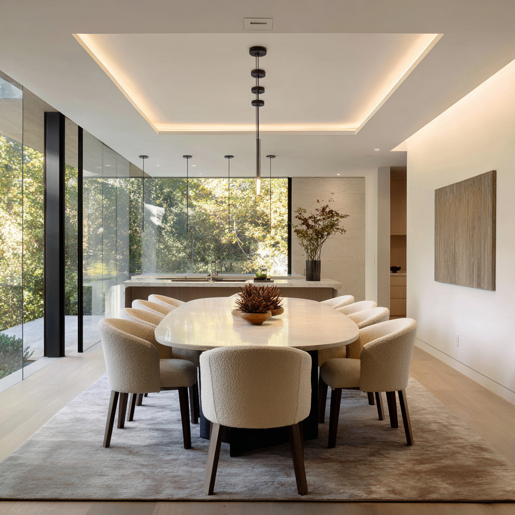 A design idea in modern formal dining rooms is that the ceiling can do the job that traditional chandeliers and heavy trim once did: it marks the dining zone as special. This happens in different languages: