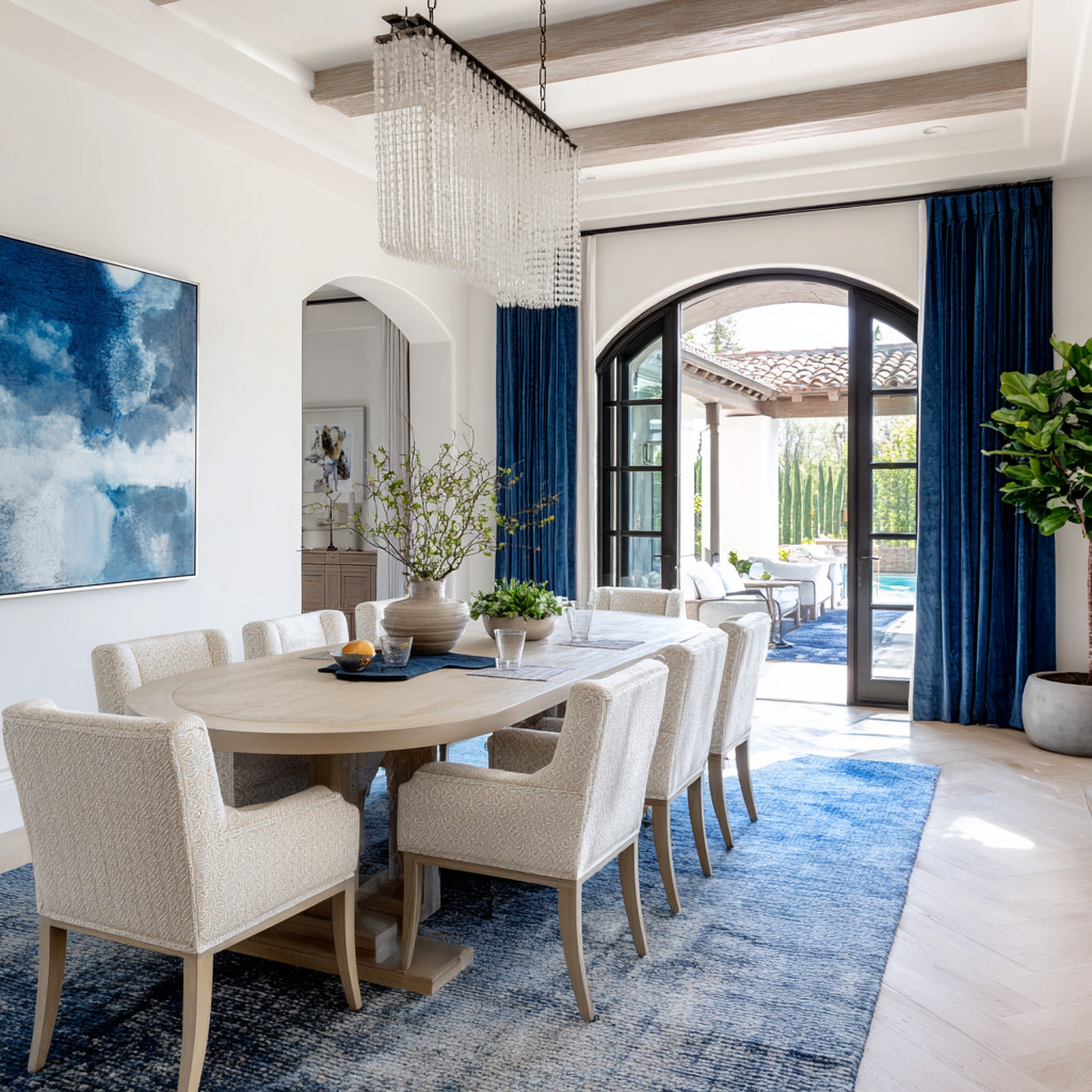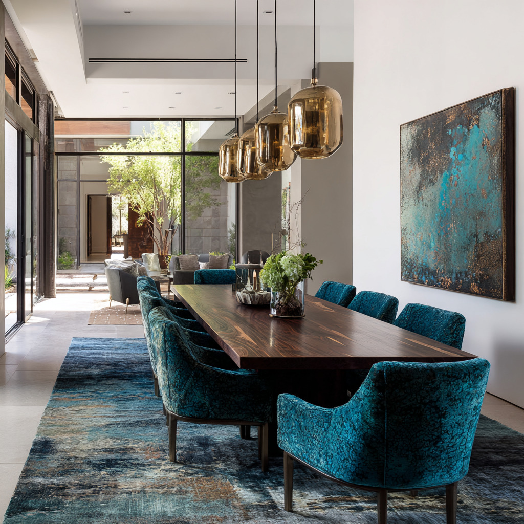 - Controlled palette: either calm neutrals with texture (bouclé + warm wood), or one saturated accent used on purpose (deep blue drapery, teal chairs).