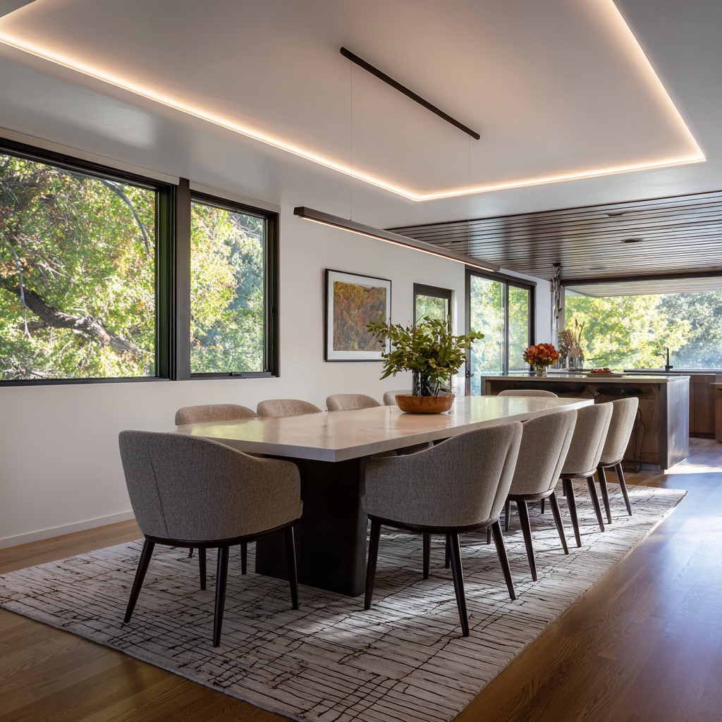 - Perimeter glow (soft light lines at ceiling edges) behaves like a halo: it flatters the room at night and gives the dining zone a gentle, contained atmosphere without visual clutter.