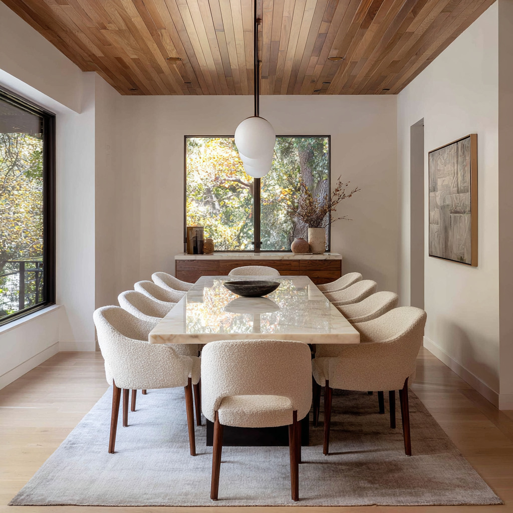 - Wood plank insets act like a warm canopy, giving the dining area its own “roof” inside the larger room.