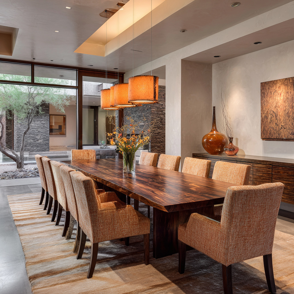- Symmetry or disciplined alignment: major elements line up (table, light, sideboard, art).