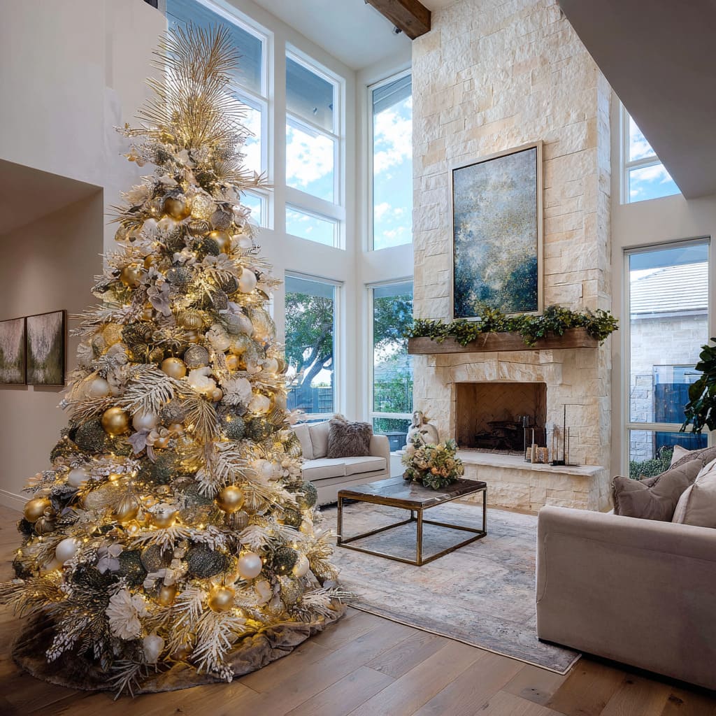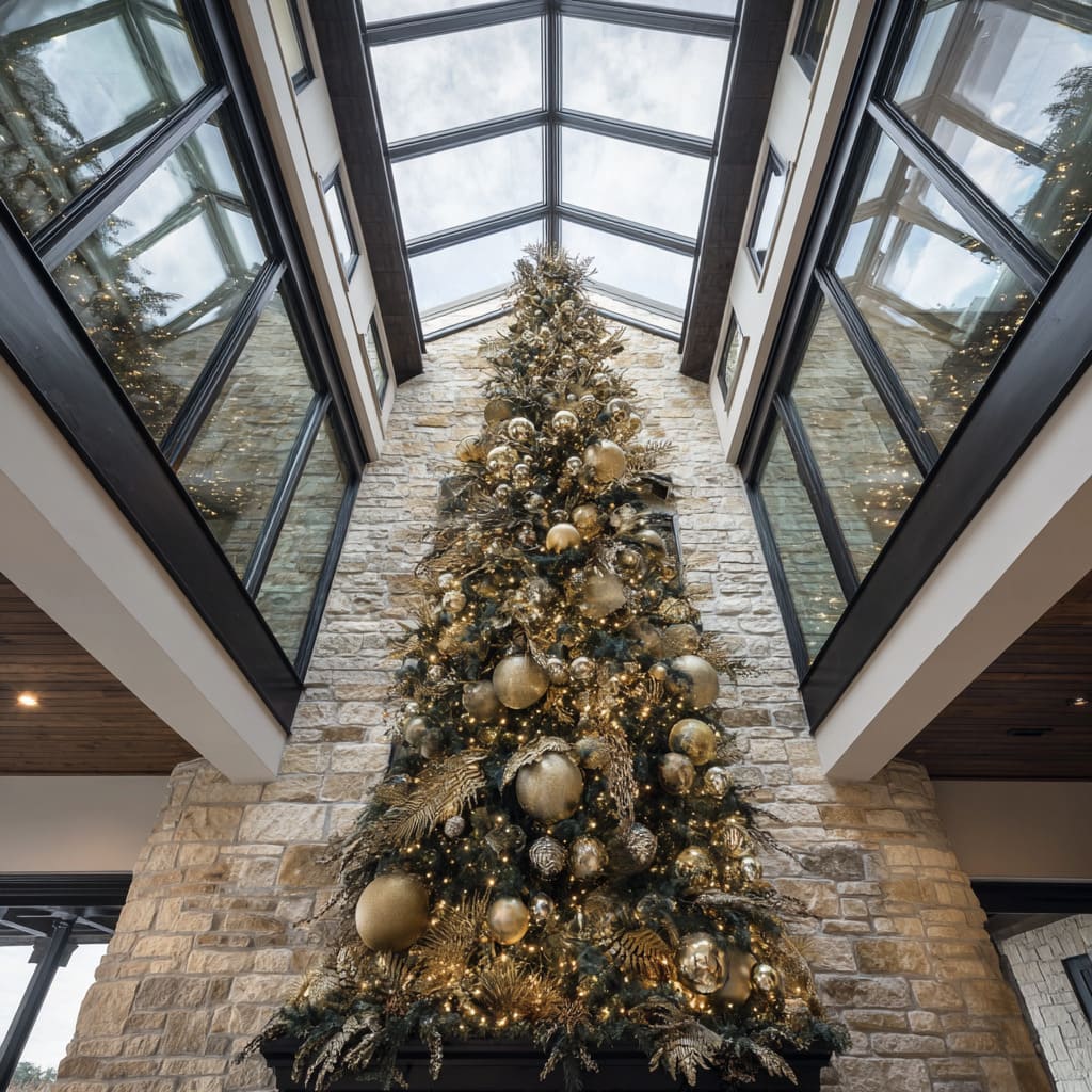 Green Christmas tree decoration ideas become more compelling when the tree interacts with the room’s structure. In large spaces with tall windows, the tree can often align with horizontal breaks in the glass or soften the strong vertical push of ceiling height.
