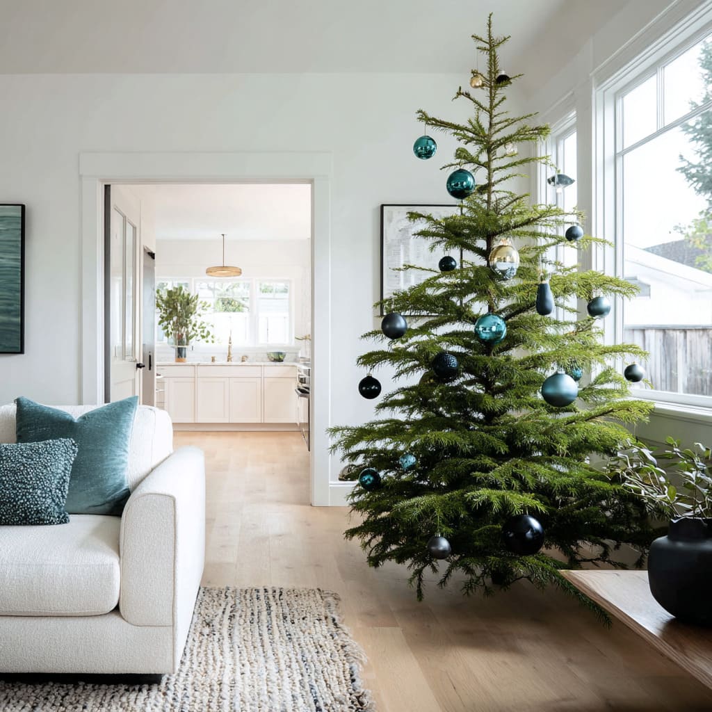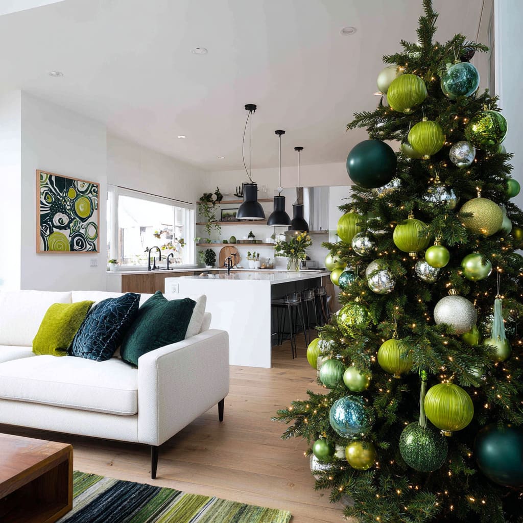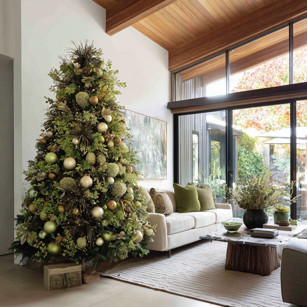 The biggest shift happens when the tree echoes tones already living in the room design—greens in cushions, ceramics, area rugs, or even outdoor foliage. When the palette feels familiar, the tree blends into the space as a vertical continuation of existing colors.
