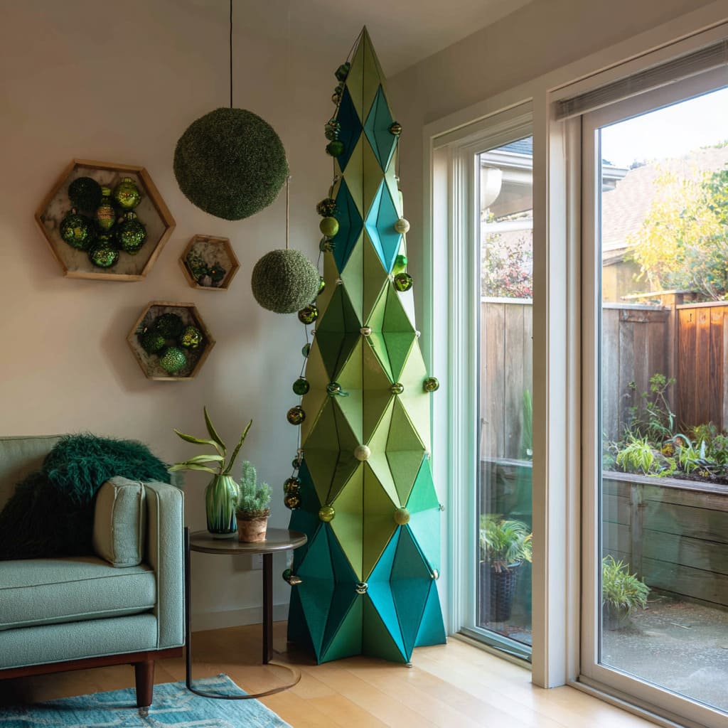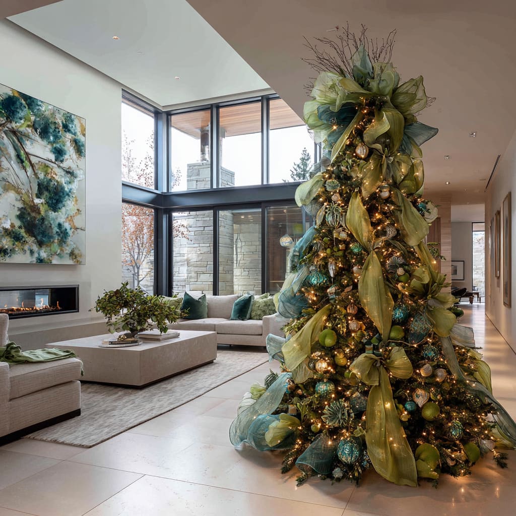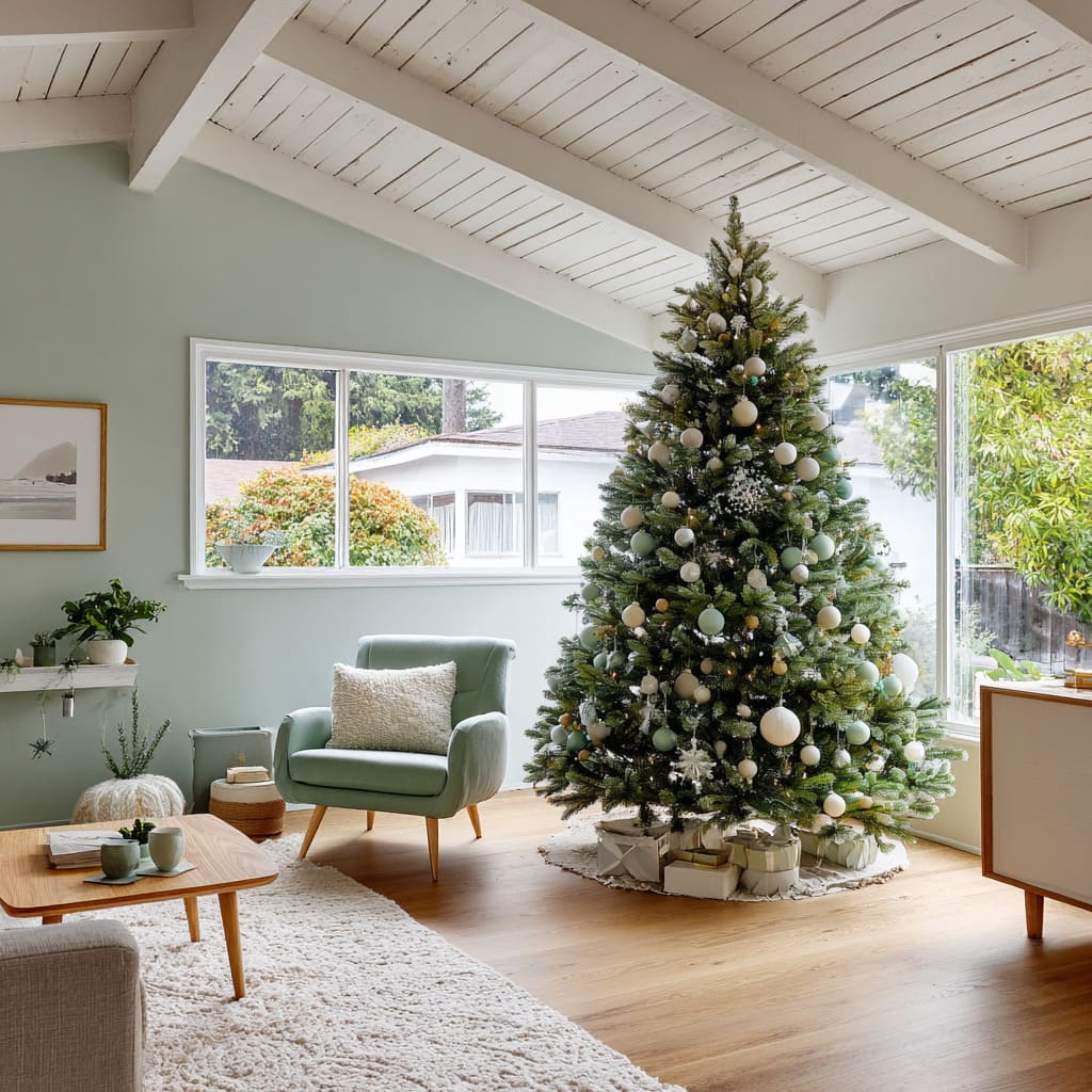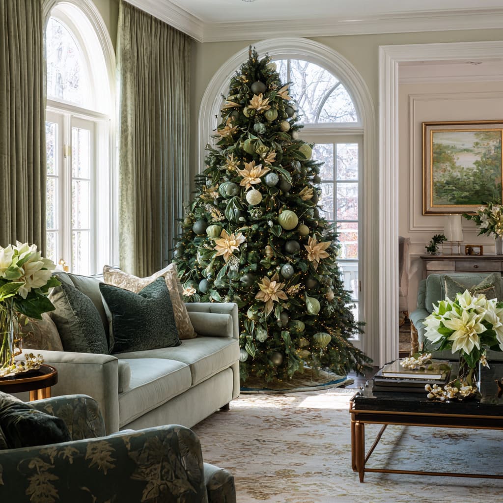 The biggest shift happens when the tree echoes tones already living in the room design—greens in cushions, ceramics, area rugs, or even outdoor foliage. When the palette feels familiar, the tree blends into the space as a vertical continuation of existing colors.